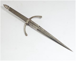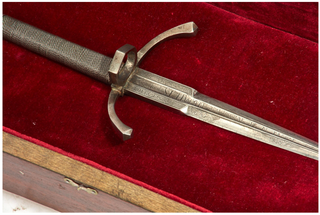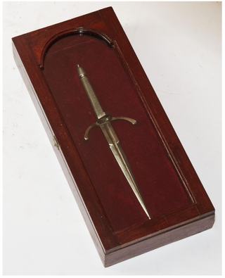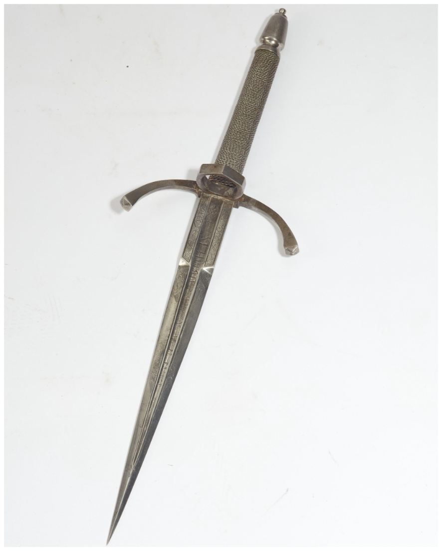 A Continental engraved steel dagger with a finger ring, in mahogany case. Evidently French but of unknown origin and date, it is apparently a reproduction of an earlier example. Overall 15.5 inches (39.5 cm) in length and with an inscription on the over the handle reading  "DOLEE TE" and then within the central section lengthwise of the blade "SCHWAN LA GARDE LE DE FRANCE." Oxidation, marks, and wear. Case 3 1/4 x 20 x 9 inches, rather worn and partially damaged.