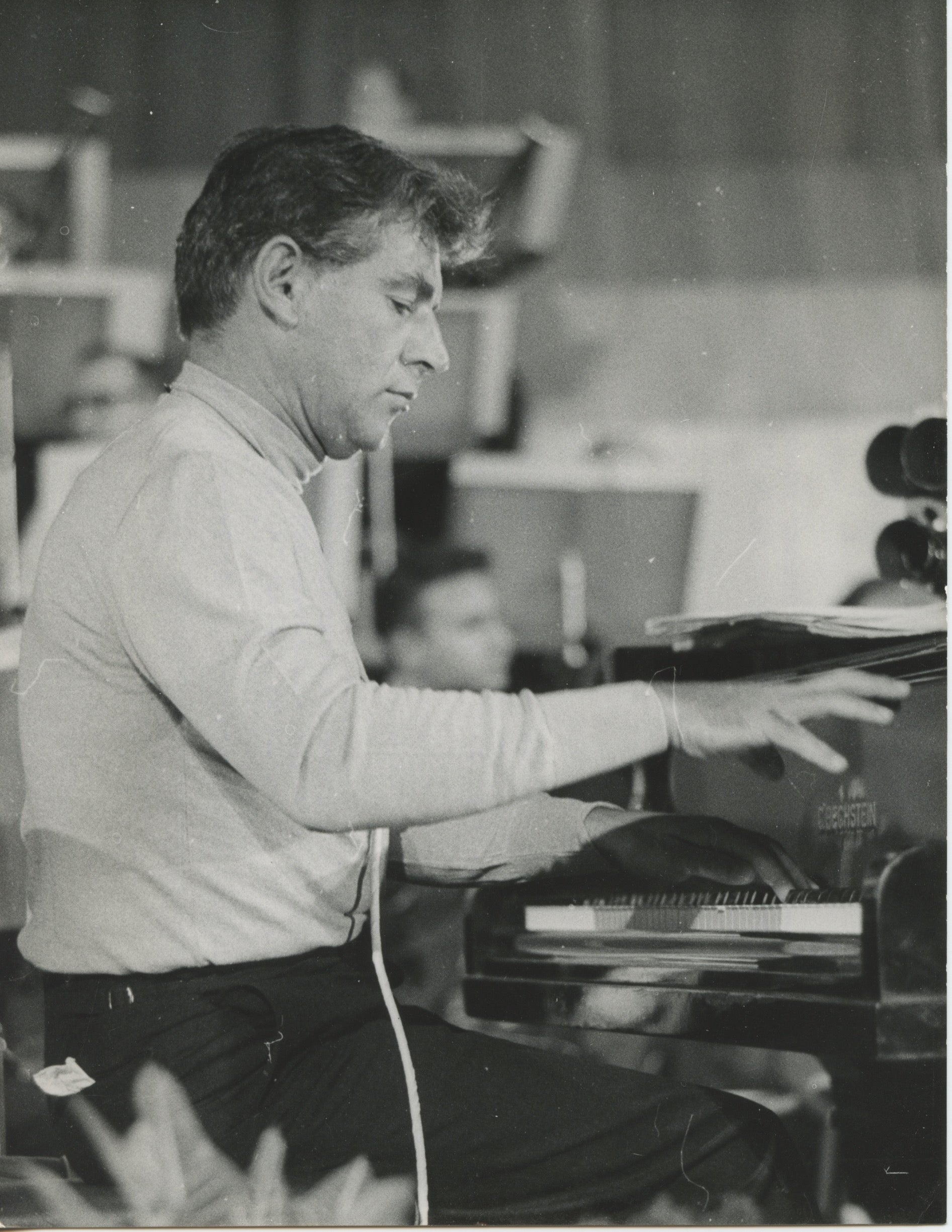 Two press photographs of the American composer, conductor and pianist from his first two concerts with the New York Philharmonic in (West) Berlin, September 22 and 23, 1960. Copyrighted by Deutsche Presse Agentur (dpa), with additional hand stamp of Agence France-Presse. Extended captions in German typed to versos regarding the guest performances. One picture is from a rehearsal, the other from the first concerts (which was part of the Berliner Festwochen festival). Both photos 8.25 x 6.25 inches (21 x 16 cm). In fine condition.