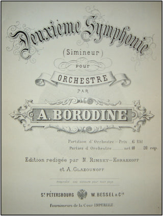 Borodine, Aleksandre. (1883-1887). Deuxieme Symphonie (Si mineur) Pour Orchestre.. St. Petersbourg: W. Bessel & Cie. . [ca. 1880]. First edition. Partition d'Orchestre. Edition redigée par N. Rimsky-Korsakoff et. A. Glazounoff. 4to. 156 pp. [PN] 671. Original grey publisher's wrappers, heavily chipped and torn, repaired with tape, and loose from folio. Internally very clean and in good condition, with some chipping at bottom right corner of pages. A very rare copy of this symphony, reissued from the plates of the first edition (ca. 1877), in this edition revised by Rimsky-Korsakov and Glazunov.