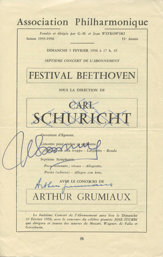 Grumiaux, Arthur. (1921–1986) & Swarowsky, Hans. (1899–1975). Signed Program. Signed bifolium (paginated 19–22) removed from a program of a concert of the Association Philharmonique of Lyon, France, February 5, 1956. The signature of the Belgian violinist and conductor is on page 20. Another signature next to it is that of Austrian conductor Hans Swarowsky, not of Carl Schuricht, the conductor billed in the program; it appears that Schuricht had to be replaced at short notice. 9.5 x 6 inches (24 x 15 cm). Horizontal fold; slightly browned; else in fine condition.