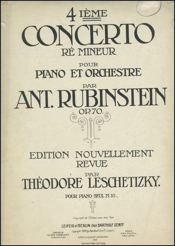 Rubinstein, Anton. (1829–1894). 4me. Concerto (Re Mineur) pour Piano et Orchestre. Op. 70 .. Leipzig: Senff. [1872].
