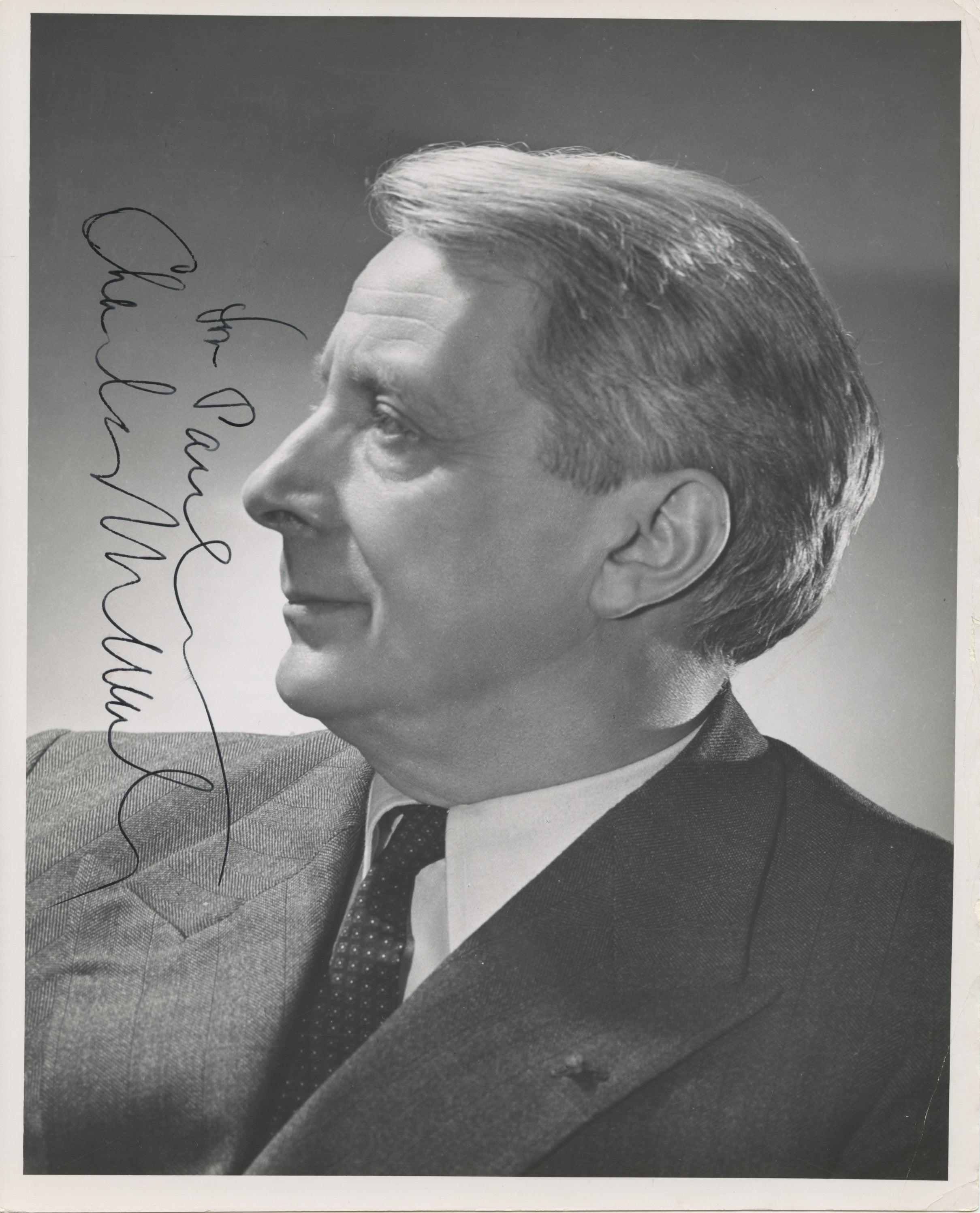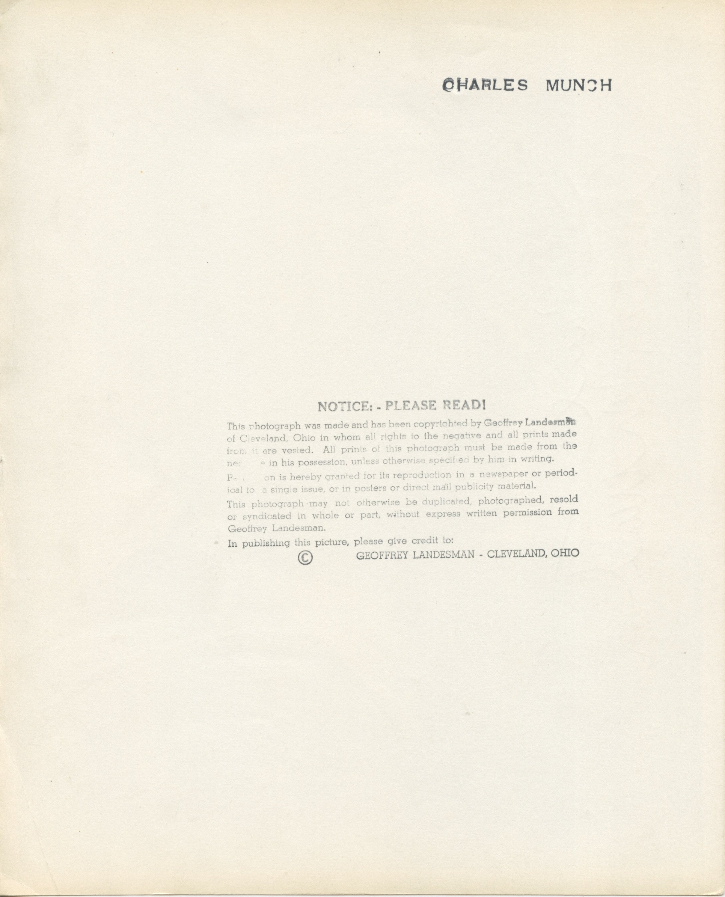 Munch, Charles. (1891–1968). Signed Photograph. Signed portrait of the French (Alsatian) conductor in profile by Geoffrey Landesman, Cleveland. Inscribed to Paul McMahon. 10 x 8 inches (25.3 x 20.3 cm). In fine condition.