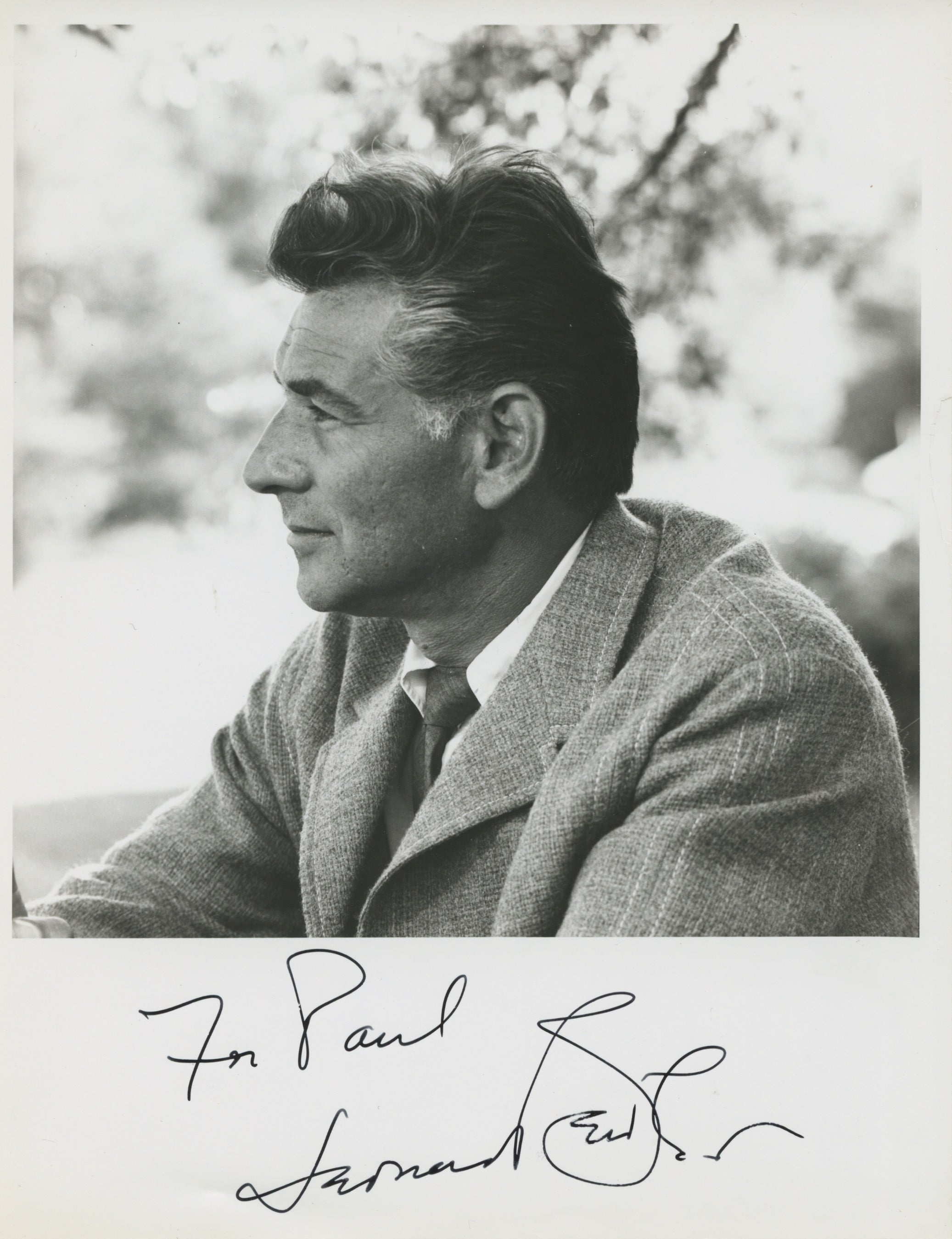 Bernstein, Leonard. (1918–1990). Signed Photograph. Signed portrait in profile of the American composer, conductor and pianist. Inscribed to Paul McMahon. Hand stamps of Columbia Records Photo to verso. 9 x 7 inches (23.1 x 17.7 cm). Slight tear to right margin; else in fine condition.