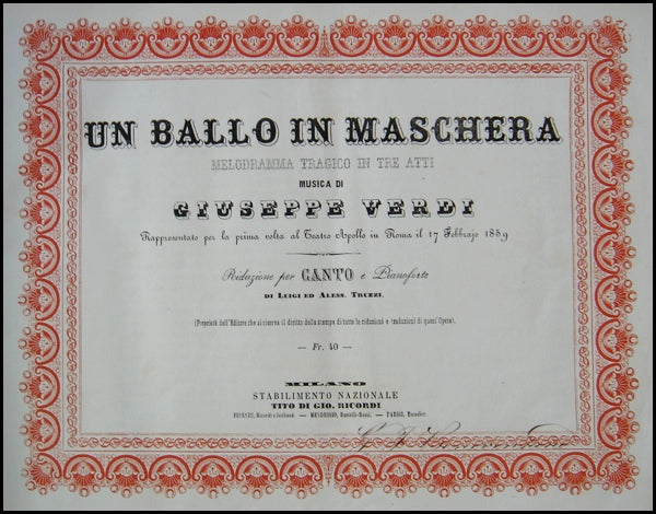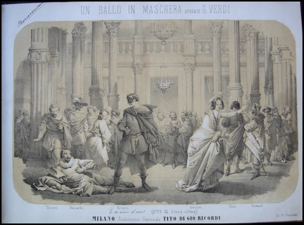 Verdi, Giuseppe. (1813-1901). Un Ballo in Maschera, Melodramma Tragico in Tre Atti [Vocal Score]. Milan: Stabilimento Nazionale. Tito di Gio. Ricordi. [1860]. First edition, first issue. 323 pp. Oblong folio (25 x 35cms), engraved music. [PN] A31034A to M31059M, each number paginated and priced separately. Title within an orange-red decorated border, additional lithographed pictorial title by Tersaghi [after Focosi], illustrating the final ball-scene, index and cast-list. Contemporary full green leather, gilt stamped on cover and spine. Nicely rebacked, with early ownership inscription on first free endpage, otherwise very good. Hopkinson 59A (a); Chusid p.31.