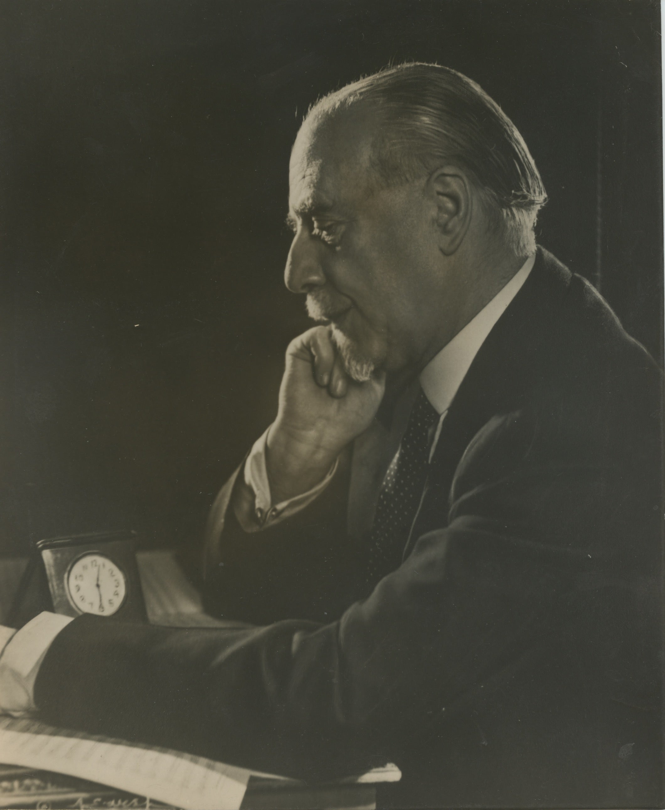 Beecham, Thomas. (1879–1961). Original Photograph. Portrait of the British conductor in his later years in profile seated at his desk studying a score. 8.75 x 7.25 inches (22 x 18.2 cm). Mounted to rigid backing, in fine condition.