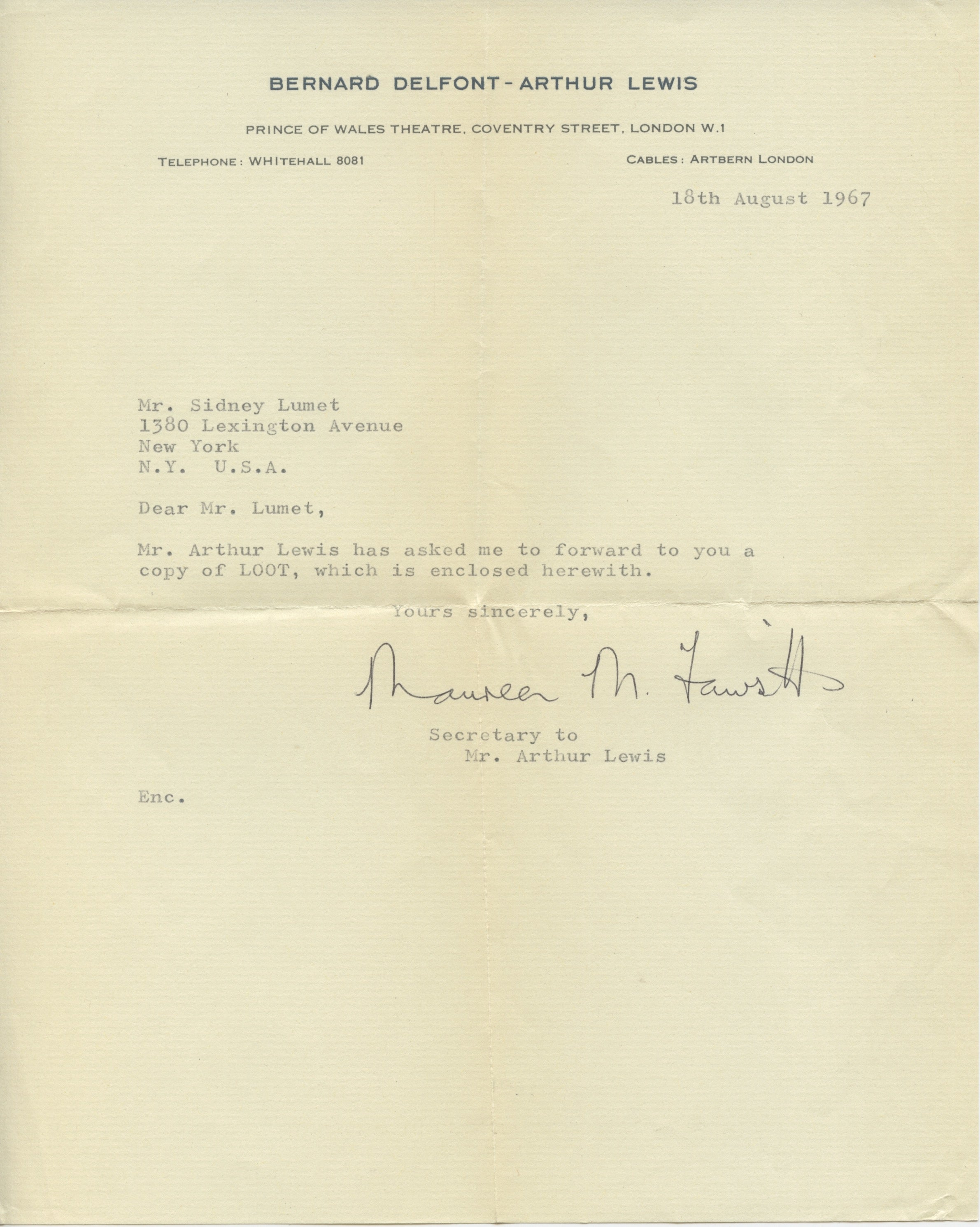 [Lumet, Sidney. (1924–2011)] . "Loot" - The Copy of Sidney Lumet, with Presentation Letter. London: Methuen & Co. Ltd. 1967. First.
