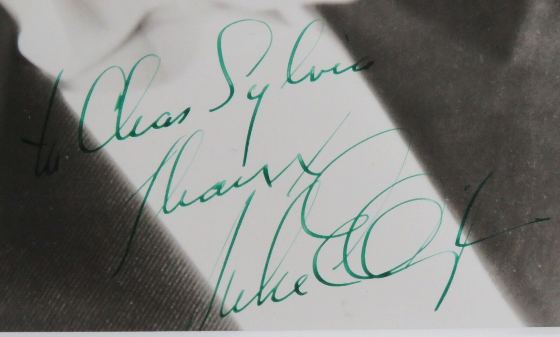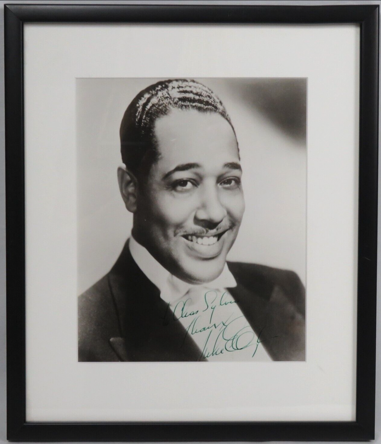 Handsome bust portrait photograph of the great composer and bandleader in a tuxedo, inscribed and signed in bold green ink. Small surface losses to verso, some light surface creases, overall in fine condition. Visible photo: 7" x 8 3/4", nicely matted and framed under UV plexiglass to 11 1/2" x 13 1/2" overall.