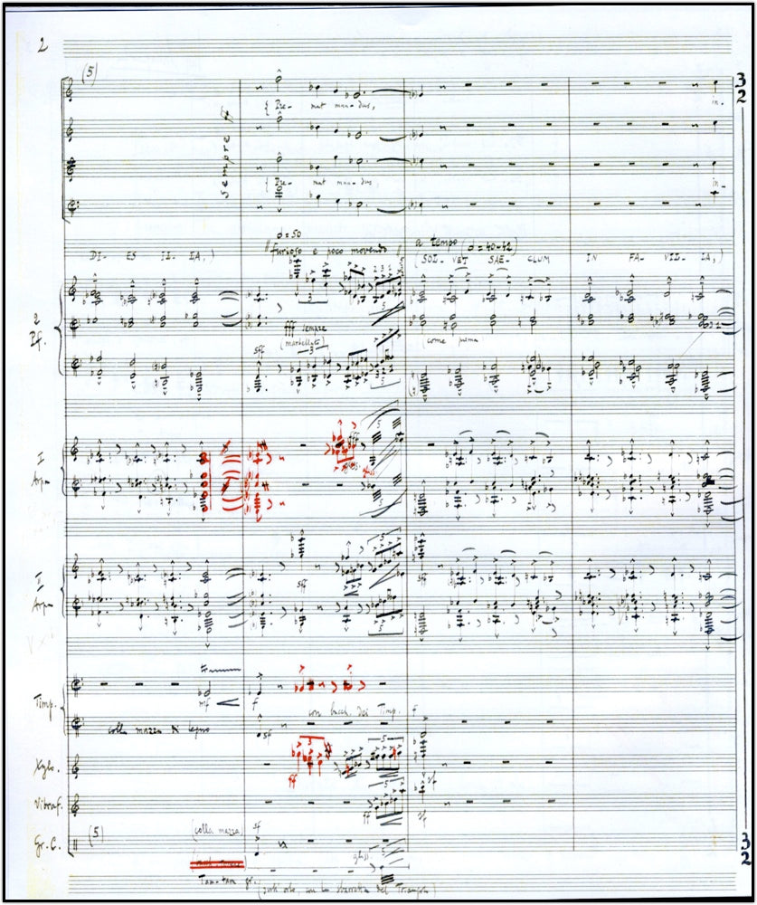 Dallapiccola, Luigi. (1904–1975). Important Autograph Manuscript, "Congedo di Girolamo Savonarola." . Congedo di Girolamo Savonarola / Canti di Prigonia, N. 3) / Per voci miste e alcuni strumenti / (1941) / Partitura. Autograph manuscript in black and red ink on printed ruled manuscript paper, 39 X 33 cm. Title with date, inscription and dedication; Quotation from Savonarola, Instrumentation, Duration, Performance note; Full score music, p. 1 - 20.