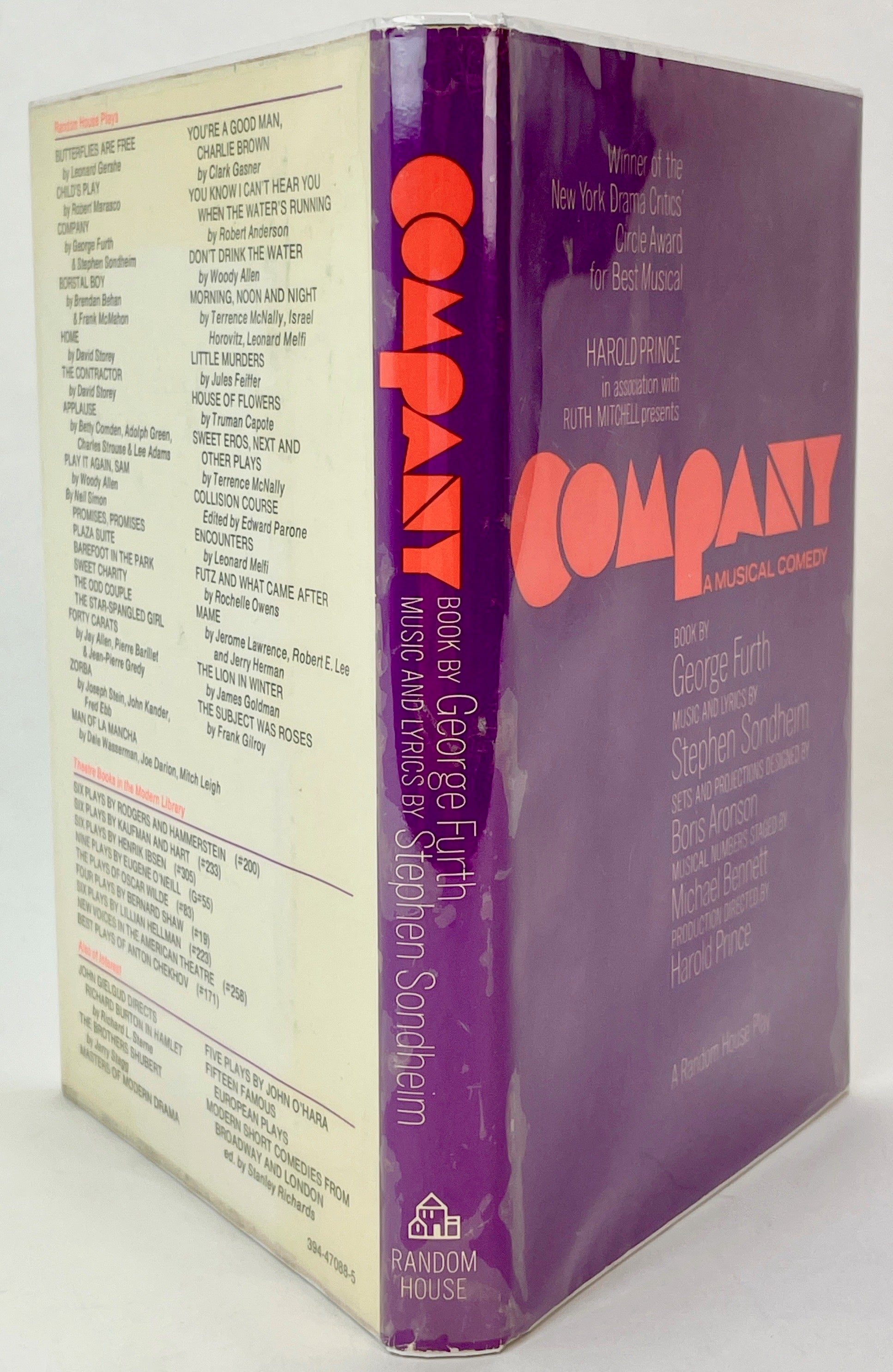 Sondheim, Stephen. (1930–2021). "Company" - SIGNED FIRST EDITION. Company: A Musical Comedy. First edition. NY: Random House, 1970. Hardcover with dust jacket, 118 pages. Signed and inscribed on the first free end page in black felt tip, "To Matt — with thanks for the persistent enthusiasm — Stephen Sondheim." Autographic condition: fine, with light offsetting from the dust jacket touching the inscription. Book condition: VG/VG, with minor creasing and some delamination to the jacket. 5.75 x 8.5 inches (14.6 x 21.6 cm).