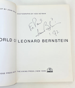 Bernstein, Leonard. (1918–1990) [Gruen, John. (1926–2016) & Heyman, Ken. (b. 1930)]. The Private World of Leonard Bernstein - SIGNED. New York: Ridge Press Book/ Viking Press . 1968. First edition. Richly illustrated with photographs, showing both the public and private sides of this phenomenal talent and personality. Boldly signed and inscribed in black ink by Bernstein on title and dated 1972. Pictorial hardcover, 191 pp. Outer printed glassine dj partially torn, else fine. Fine.
