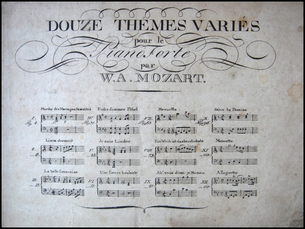 Mozart, Wolfgang Amadeus. (1756–1791). Oeuvres de Mozart. Cahier II. Douze thémes variés pour le pianoforte. [K 352, 264 etc.] . Leipzig: Breitkopf & Hartel. [ca. 1798]. Oblong 4to. 120 pp. Rough edges with several corners repaired, scattered foxing and soiling at margins, otherwise a nice copy. RISM M 7307.