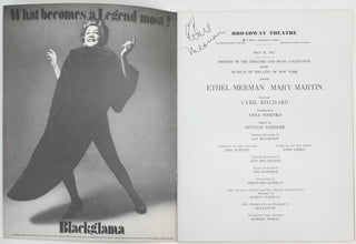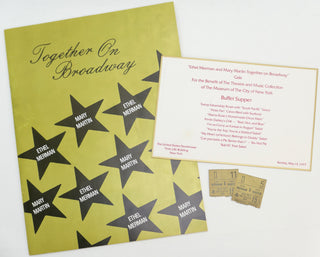 Signed program from the joint performance, New York, 15 May 1977, by the two Broadway legends: the powerful-voiced American actress of stage and film musicals, Ethel Merman, and the beloved American actress and singer, Mary Martin. "Together on Broadway," signed on title-pages. The program, which may be flipped and read from the reverse until mid-point, contains two title-pages, at front and at rear, one listing Merman first, the other listing Martin first (and with commensurate Blackgama "What becomes a Legend most?" fur adverts, featuring each). Merman signed her title-page at upper left, Martin inscribed hers at middle left, in light blue ink: "Happy Birthday / Love / Mary Martin." Includes two ticket stubs and a cardstock menu for the associated Buffet Supper for the "Benefit of the The Theatre and Music Collection of the Museum of the City of New York," including such dishes as "Tramp Steamship Roast with 'South Pacific' Sauce" and "Annie Oakley's Chili - Red, Hot, and Blue"! 4to, printed wrappers, stapled. Very fine.