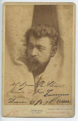 Tamagno, Francesco. (1850-1905). Signed Photograph as Otello. A desirable signed cabinet card photograph of the most famous dramatic tenor of the golden age, creator of the historic title role in Verdi's Otello, in which he is here depicted. Photograph by Falk of New York, inscribed "Al Signor R. Stowell / Ricordo di Frsco. Tamagno / Denver 28/2.90 (Otello)." 4.2 x 6.6 inches (10.5 x 16.6 cm). Foxing spots, else fine. A great rarity, one of only a handful of signed photographs of Tamagno in his most famous role that we have traced on the market in more than 30 years.