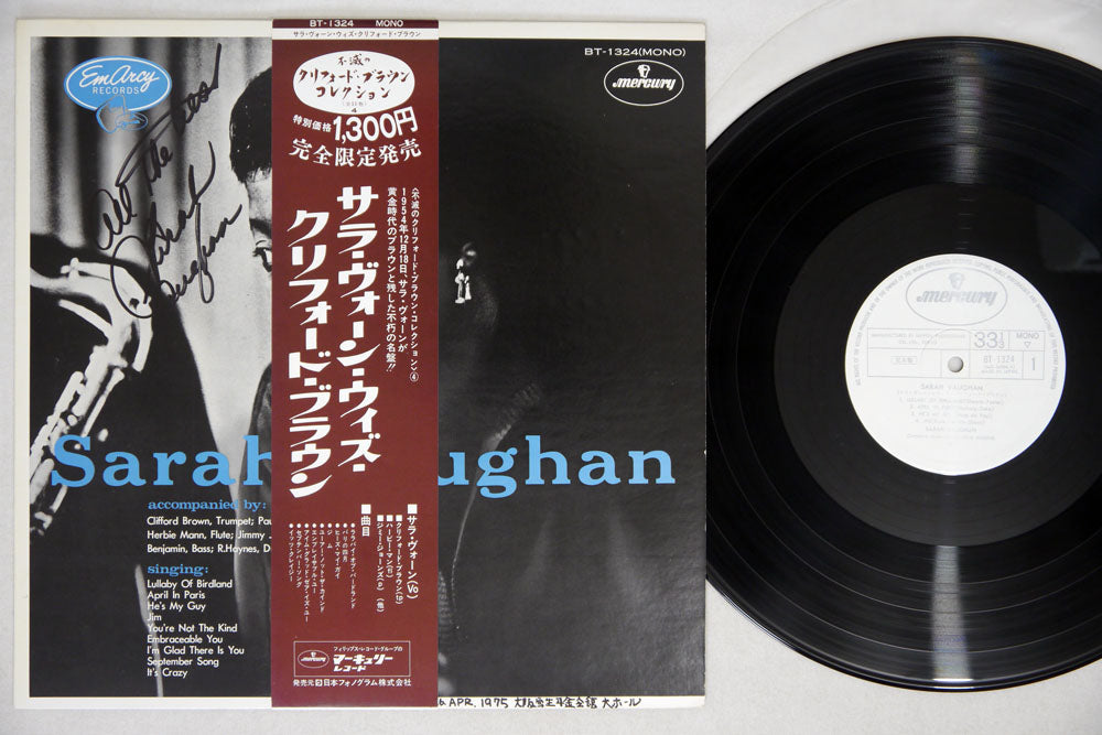 Signed LP from the innovative "Divine" jazz singer who has signed boldly on the cover of a later Japanese pressing of her 1955 album Sarah Vaughan [with Clifford Brown]. Label: MERCURY BT-1324; Cover, record and Obi strip all in very fine condition. Autograph obtained 26 April, 1975 according to note in the collector's hand, lower edge.