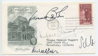 Autograph signatures of the three great conductors penned in later black ink on a 1955 first day cover honoring the 150th anniversary of the PA Academy of Arts. One further unidentified signature (Richard Bahr?). Postmarked Philadelphia, 1955. Fine. 16.5 x 9.2 cm.