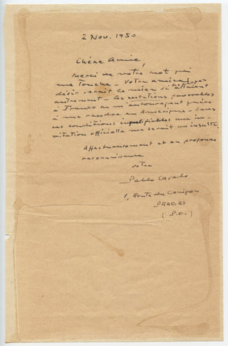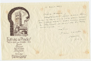Three autograph letters from the great Spanish composer, conductor, and cellist, one of the most influential musicians of the 20th century, also well known as a humanitarian. All addressed "Chère Amie" and almost certainly to cellist Madeline Foley, each one page, dated 2 November, 1950; 11 April, 1953; 11 May, 1955. All sent from Prades, the later two both on letterhead of the Prades Festival, all with scattered staining, small creases and small tears around the edges.