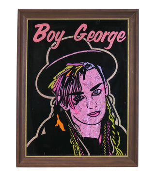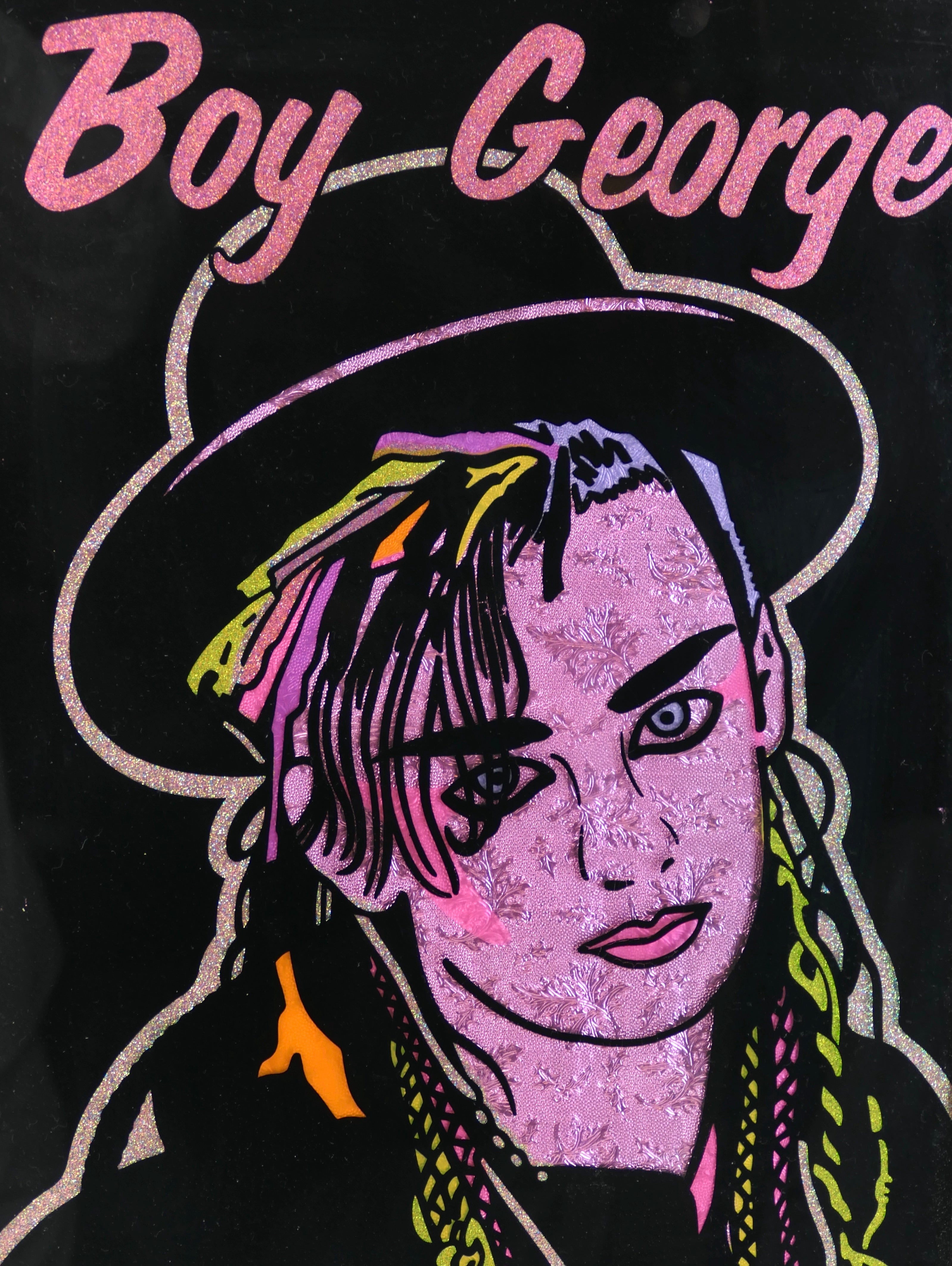 Vibrant and colorful art glass portrait, ca. 1980s, of the popular English singer-songwriter and DJ who rose to fame as the lead singer of the pop band Culture Club. Colored glass over tinsel, sparkle paint and other mediums. 15 x 19 inches.