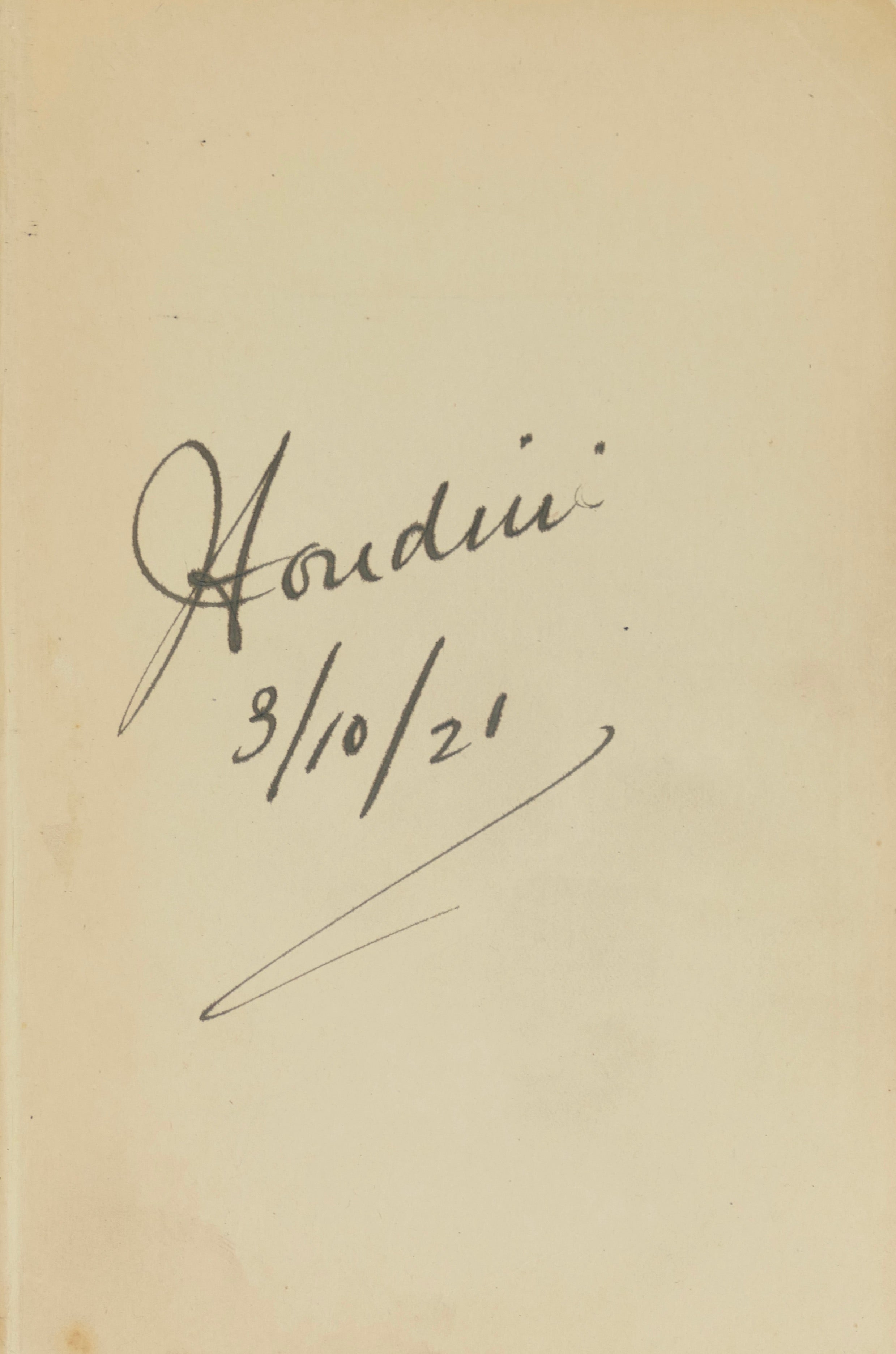 Hardcover. 8vo. 240 pp. Signed to the front free endpage by the famed magician and escapologist "Houdini / 3/10/21." Publisher's pictorial cloth, without dust jacket. Frontis portait of Houdini with losses along the inner gutter and facing title, cloth quite worn, scattered foxing and toning, p. 171 partially torn and repaired with tape and the following page fully torn but present. Else fine.