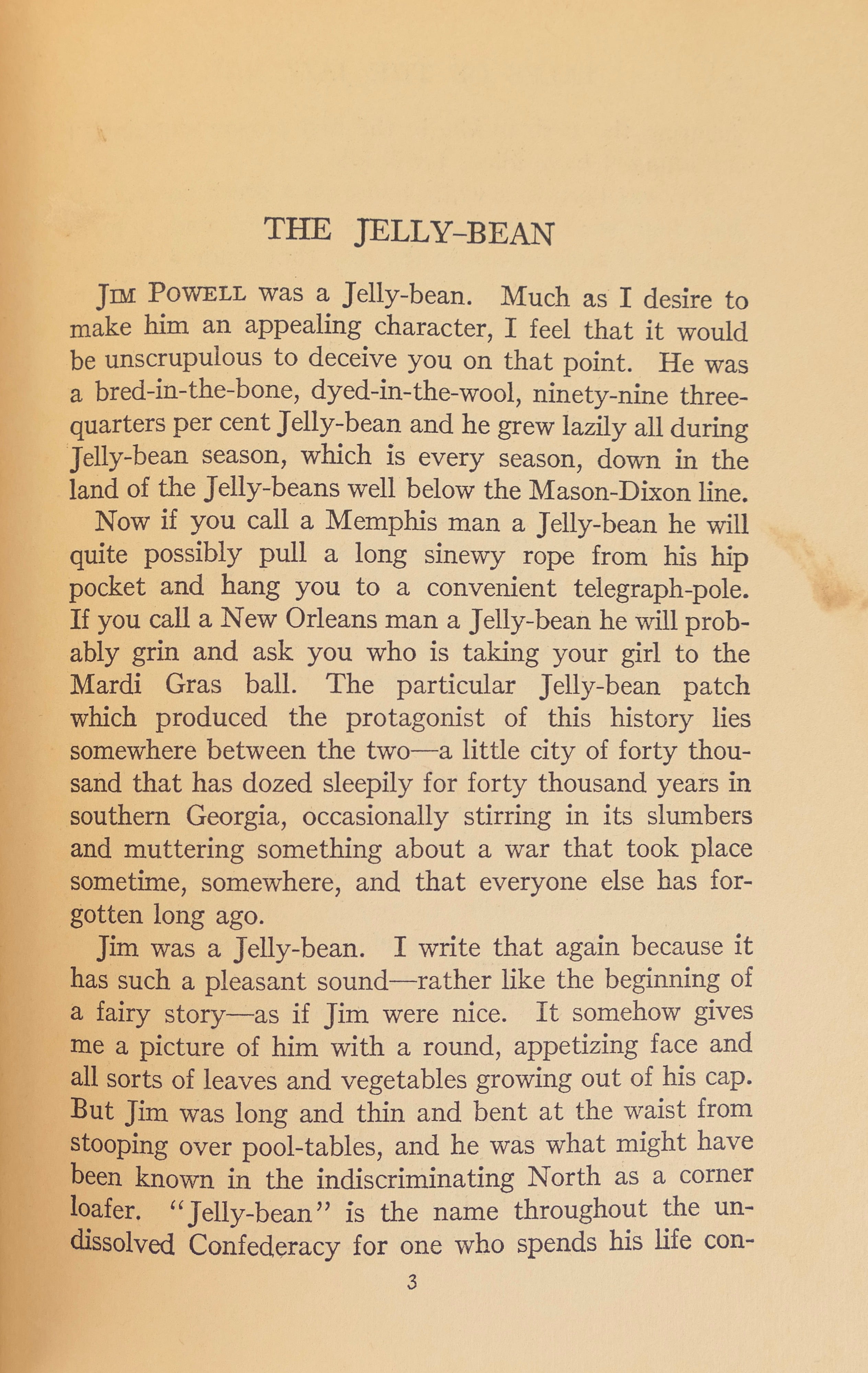 Tales of the Jazz Age is Fitzgerald's second collection of short stories, published shortly after his second novel The Beautiful and the Damned; as per Scribner's sales tactics, each collection of short stories was scheduled to follow the publication of a novel, with the goal of the short story collection to feed off of the popularity of its companion novel. Tales of the Jazz Age includes some of the author's most well-known short stories, organized thematically into three sections: "My Last Flappers," "Fantasies," and "Unclassified Masterpieces." Specifically, it includes 11 stories: "The Jelly-Bean," "The Camel's Back," "May Day," "Porcelain and Pink," "The Diamond as Big as the Ritz," "Tarquin of Cheapside," "Oh, Russet Witch!," "The Lees of Happiness," "Mr. Icky," "Jemina," and "The Curious Case of Benjamin Button,"