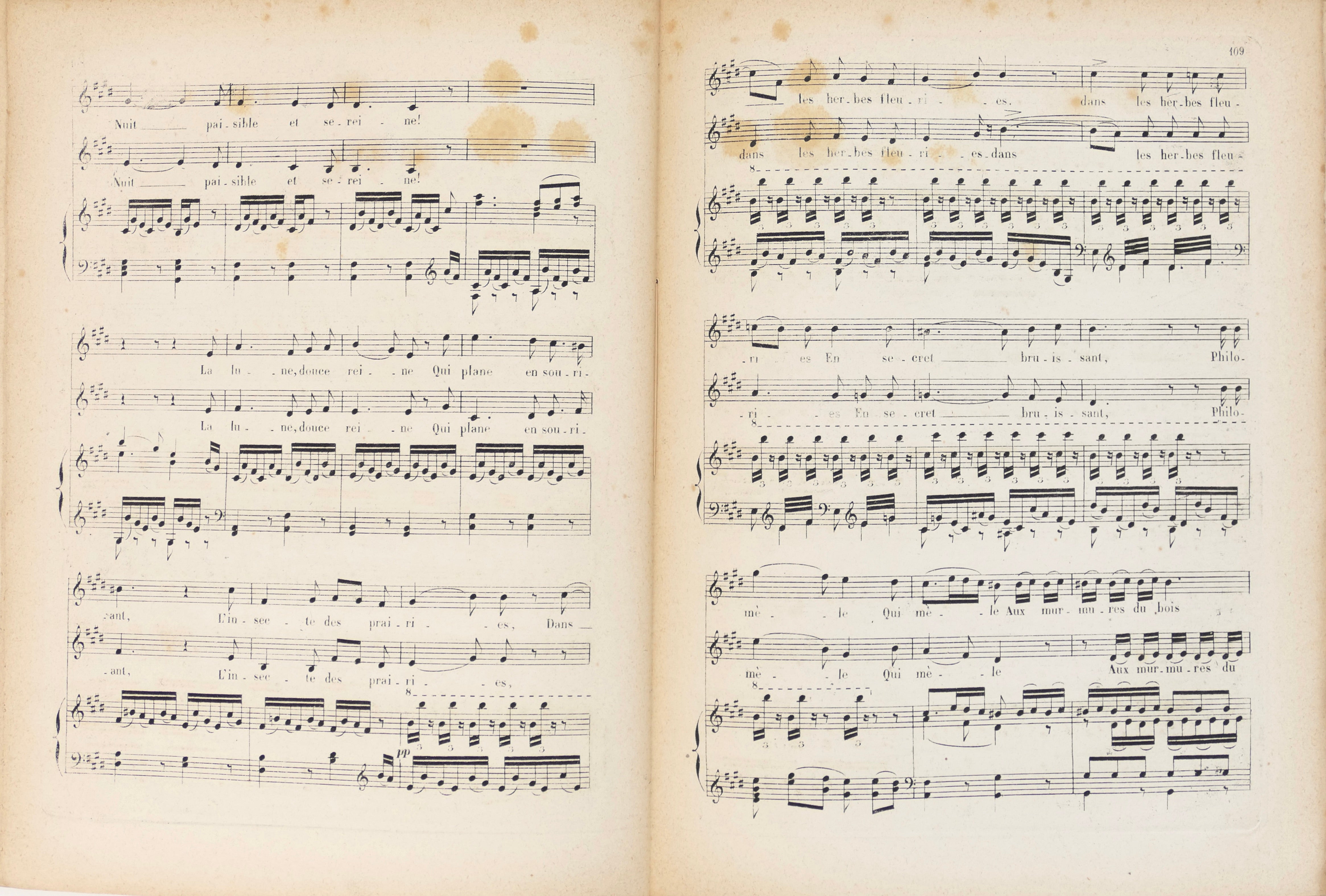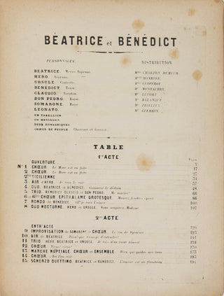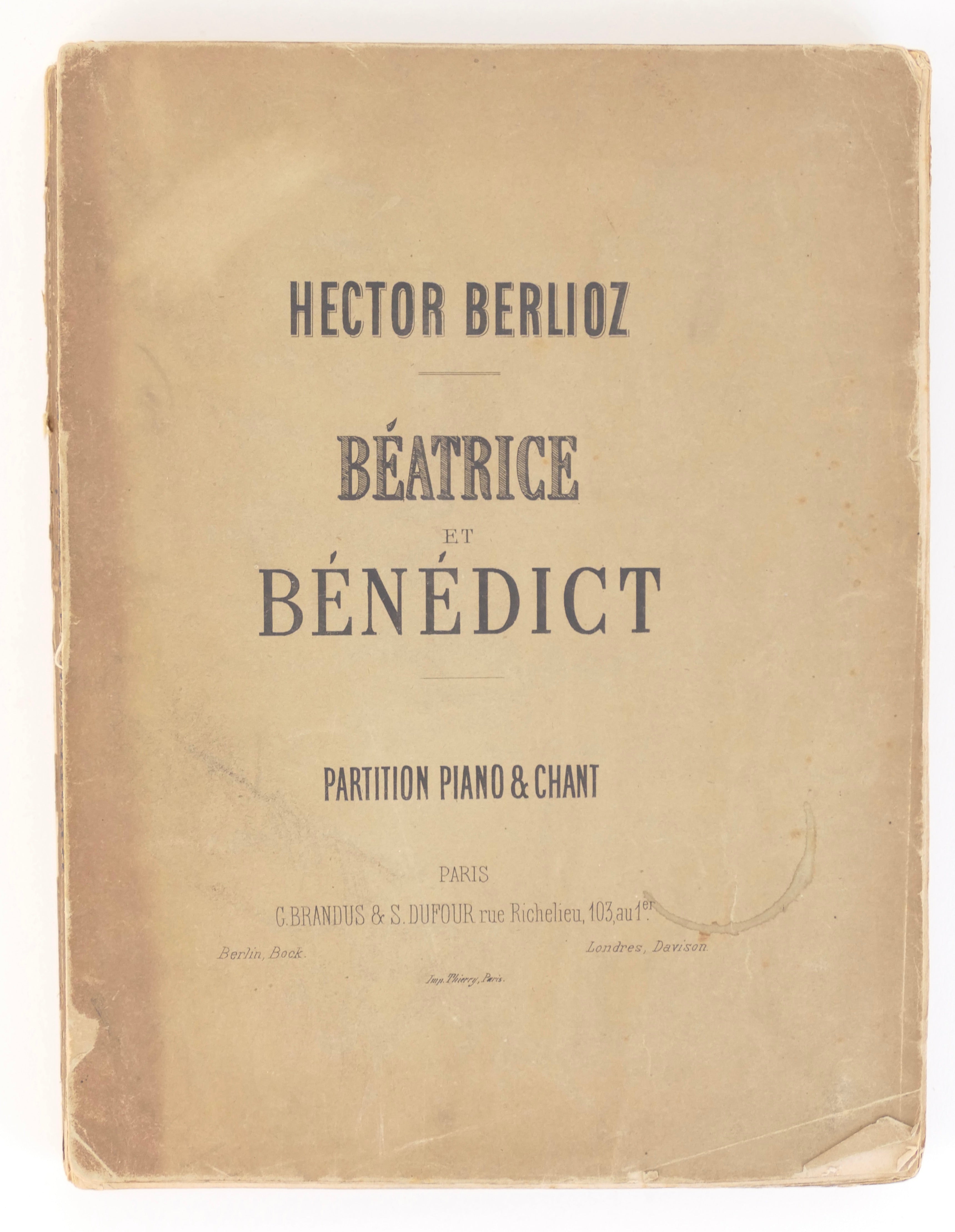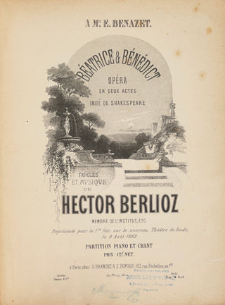 BÉATRICE ET BÉNÉDICT Opera en deux actes imite de Shakespeare...represente pour la 1re fois sur le nouveau Theatre de Bade, le 9 aout 1862. First edition, piano-vocal score.4to. [Title]; (vb); [Personnages / Table} 2 -200 pp. Original publisher's wrappers worn and toned, barely holding together with front and most signatures attached by one thread only and rear wrapper fully separated and torn. Scattered foxing, otherwise good with no markings. Hopkinson 63A.
