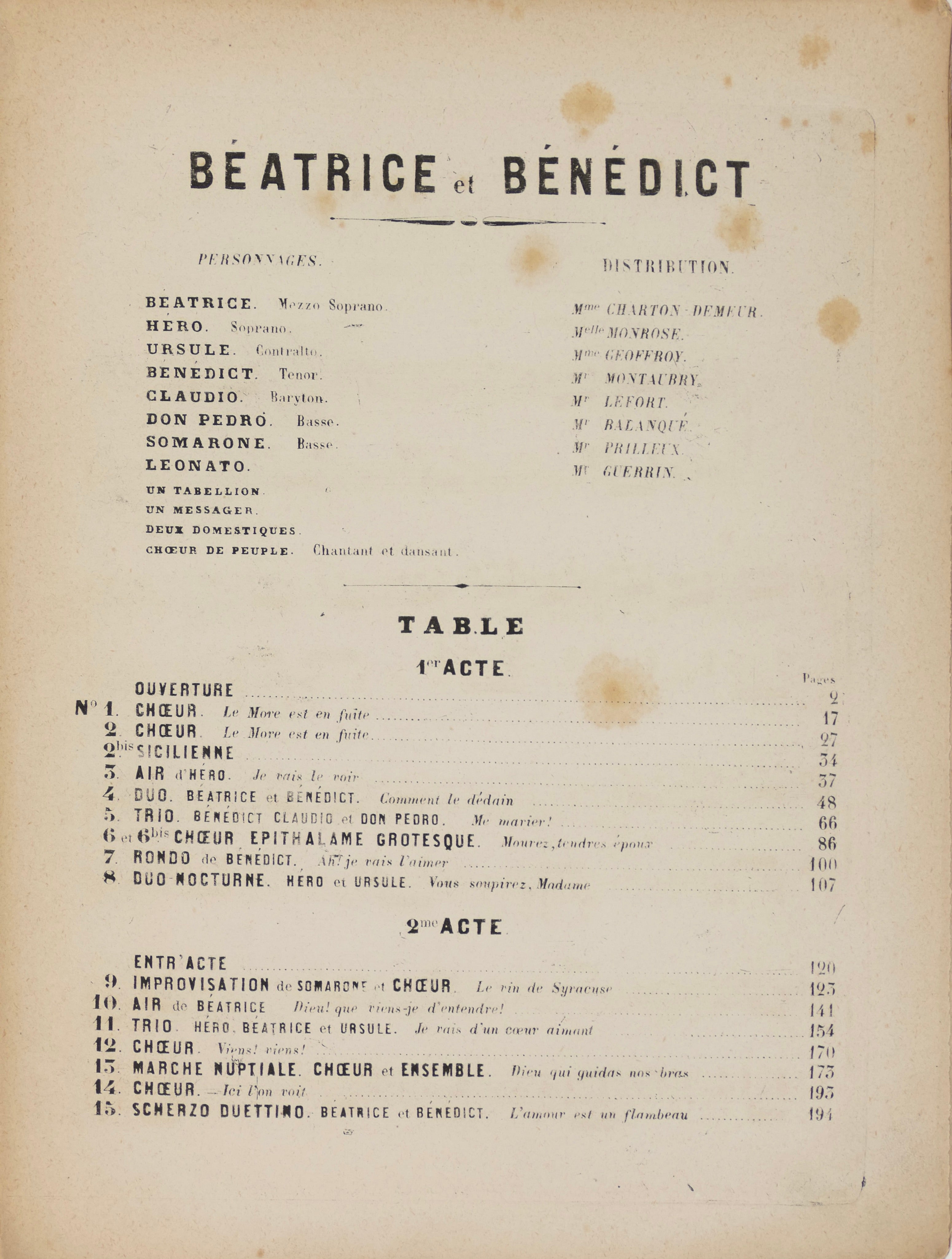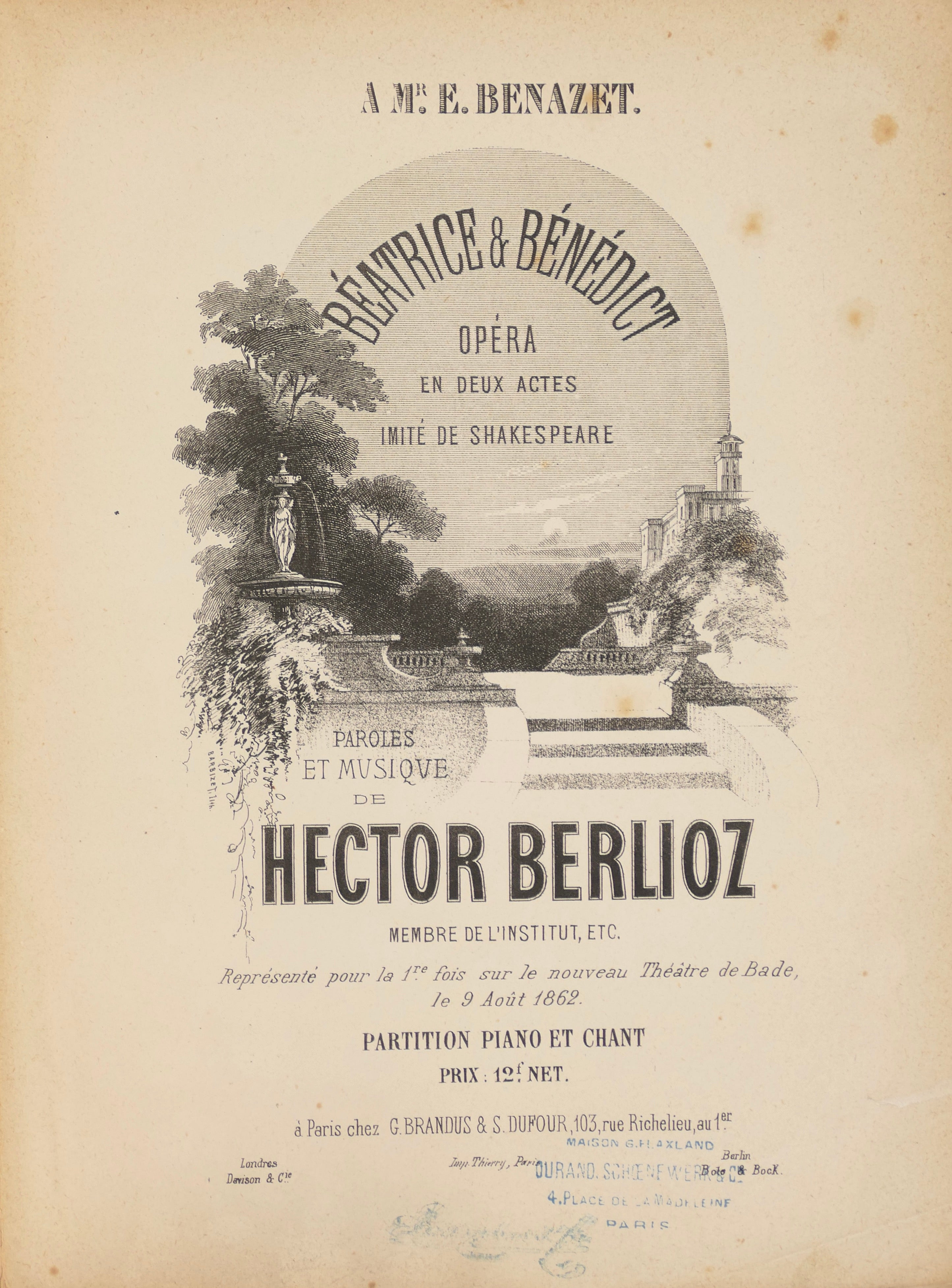 "His last opera was an opera comique, composed almost as a relaxation after the travail of Les Troyens. Beatrice et Benedict was begun in 1860 and first performed in 1862. Berlioz made his own libretto from Shakespeare's Much Ado About Nothing,.... 'It is a caprice written with a point of a needle,' in his own words" (Grove 2: 594).