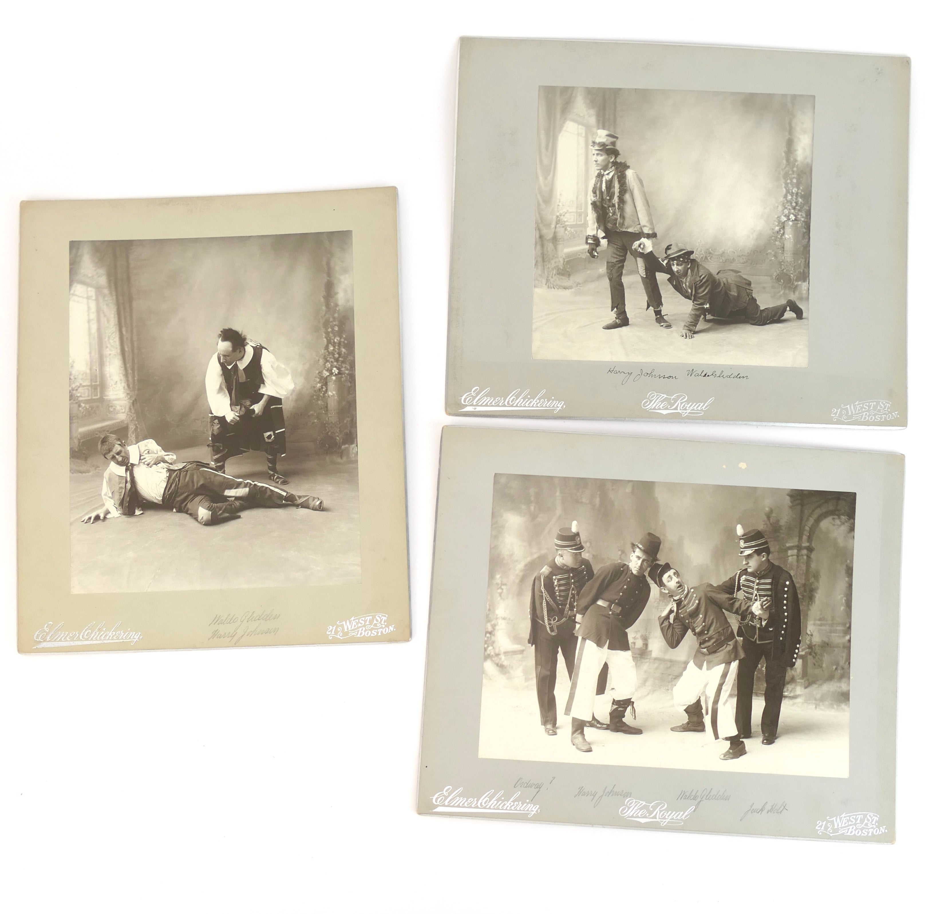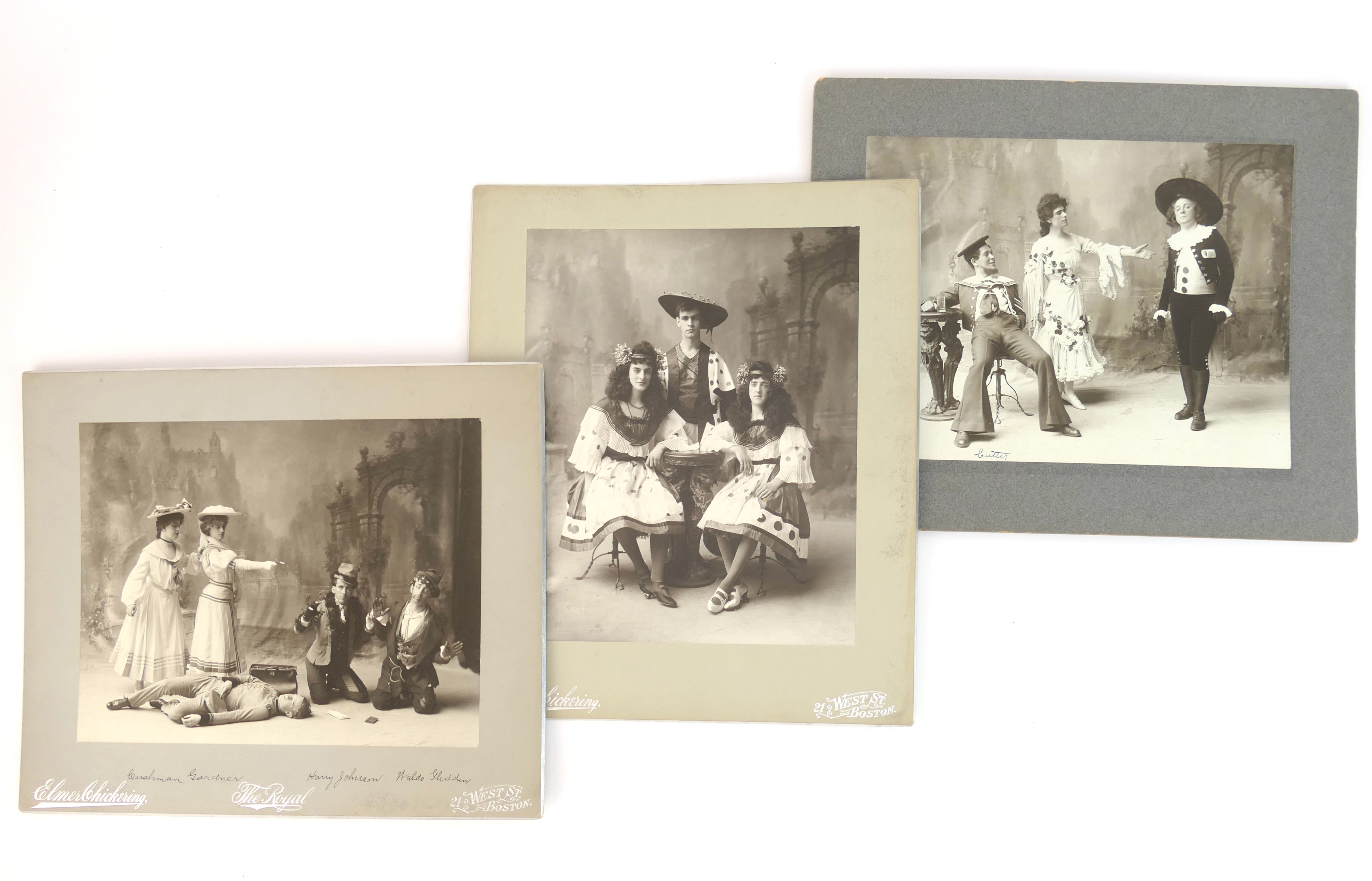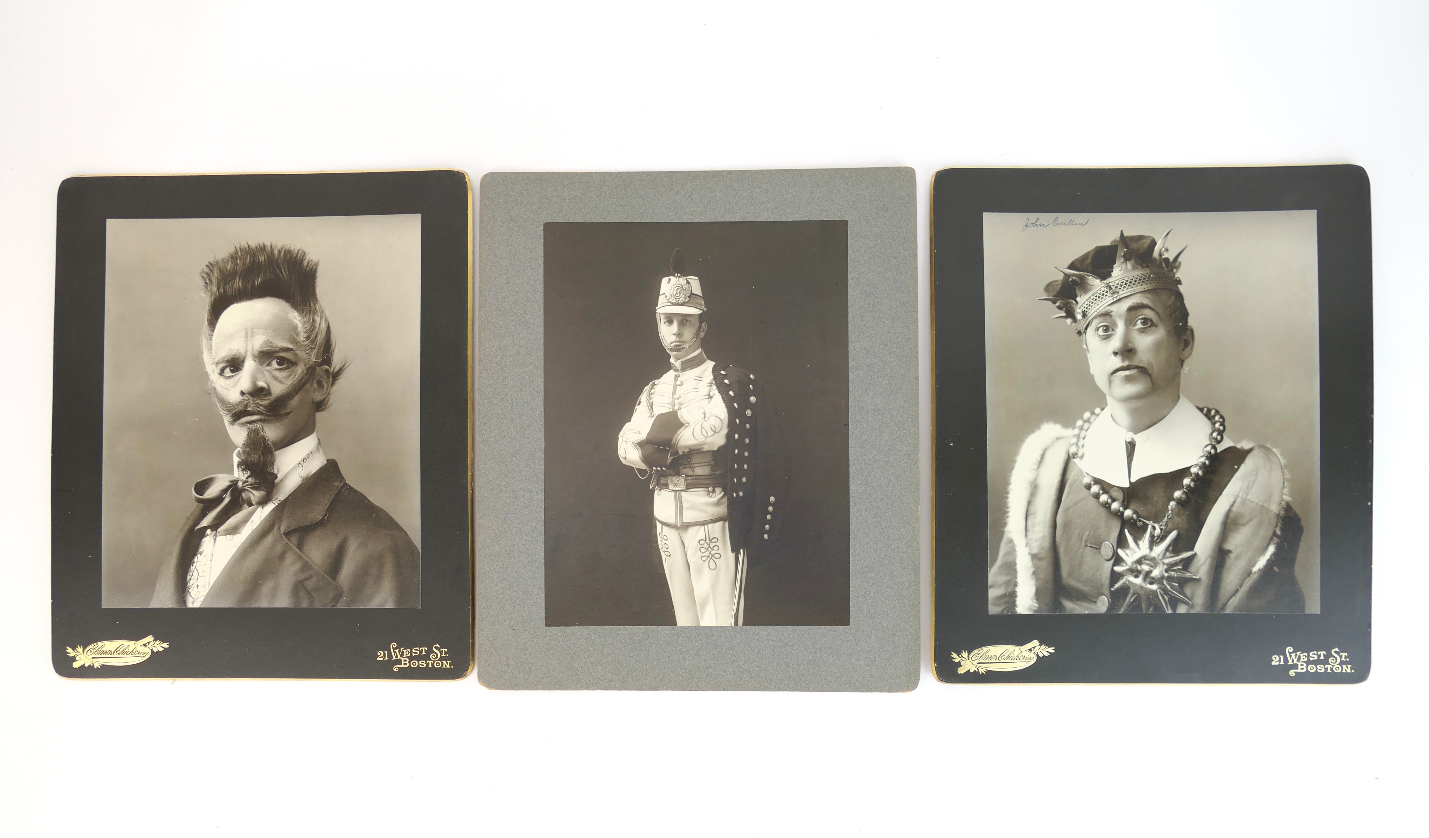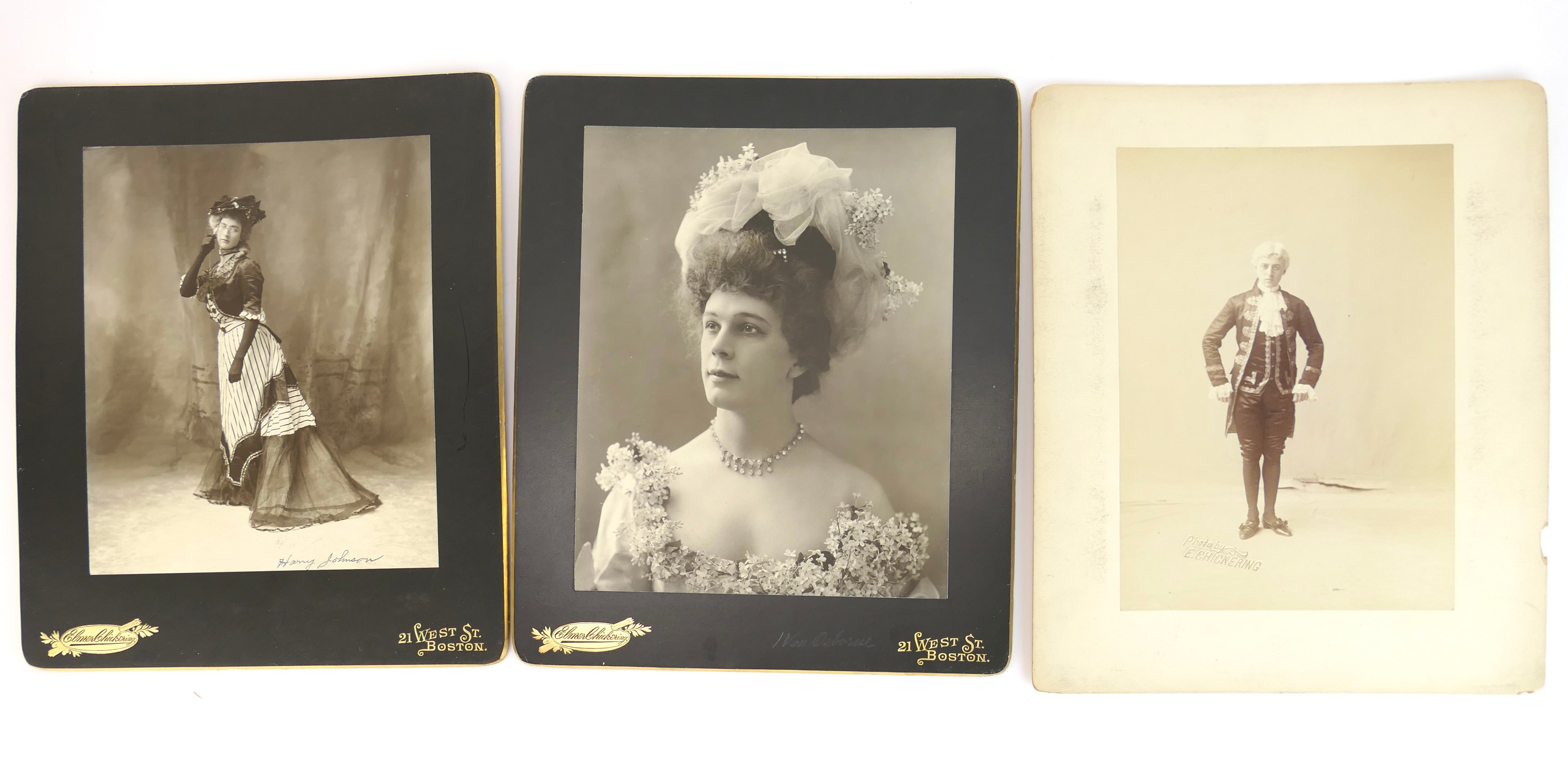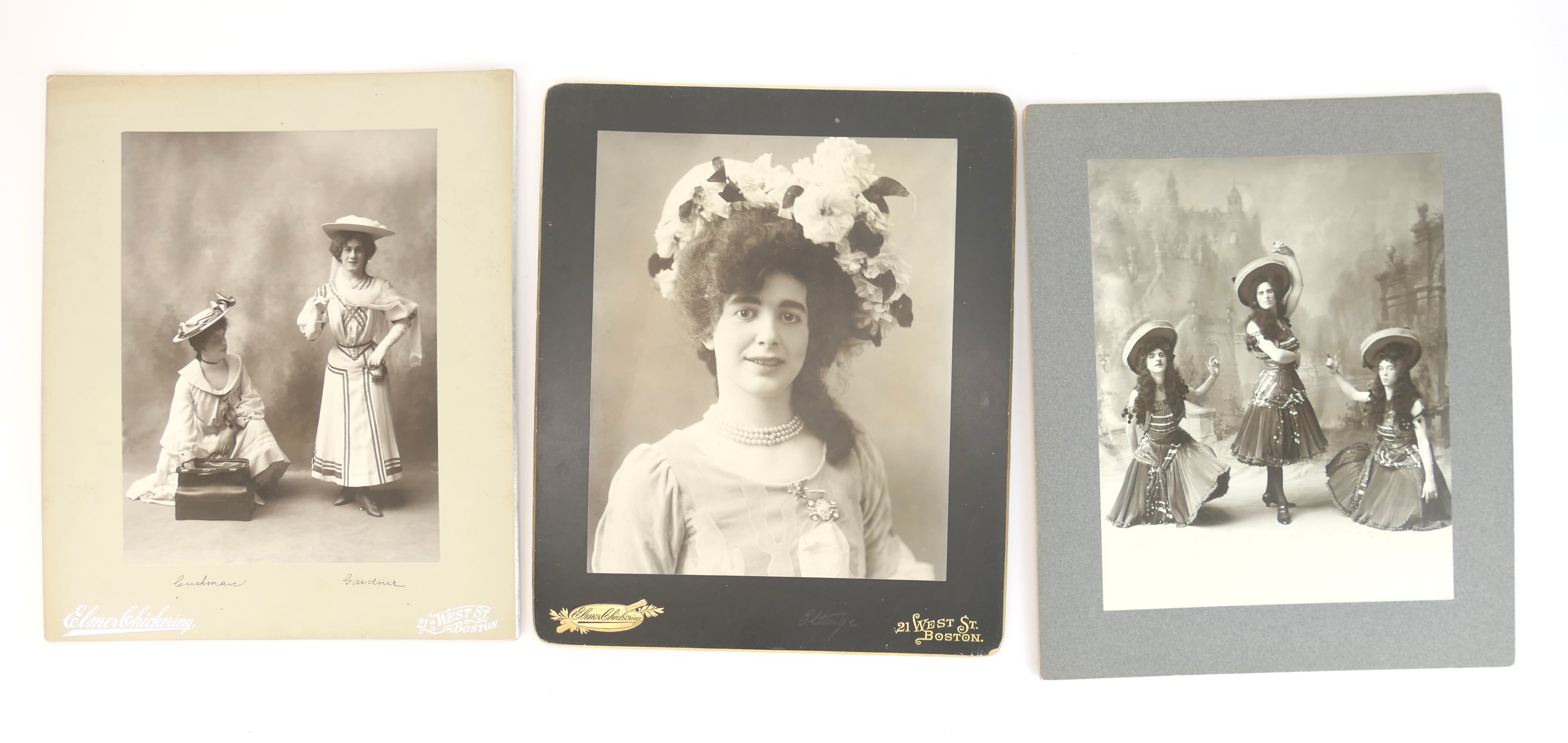 An important collection eight-eight original Elmer Chickering of Boston photographs documenting the performers in the Boston Bank Officers Association theatrical drag shows 1897 to 1908, most with men in drag, and including seven images of the young Julian Eltinge at the very start of his extraordinary career, and including characters from the productions 1897 "Pinafore on the Half Shell," 1900 "Miss Simplicity," 1900 "The Prince of Bohemia," 1903 "Baron Humbug," and 1908 "The Boy and the Girl." Including 22 Imperial cabinet cards (10 x 12 inches), 30 boudoir cabinet cards (6.75 x 20 inches), and 33 regular cabinet cards (7.5 x 5.25 inches). A number of the photographs signed by the performers and/or inscribed to the verso with production details or dates. Generally in very fine condition. A fabulous grouping that could support an entire exhibition alone.