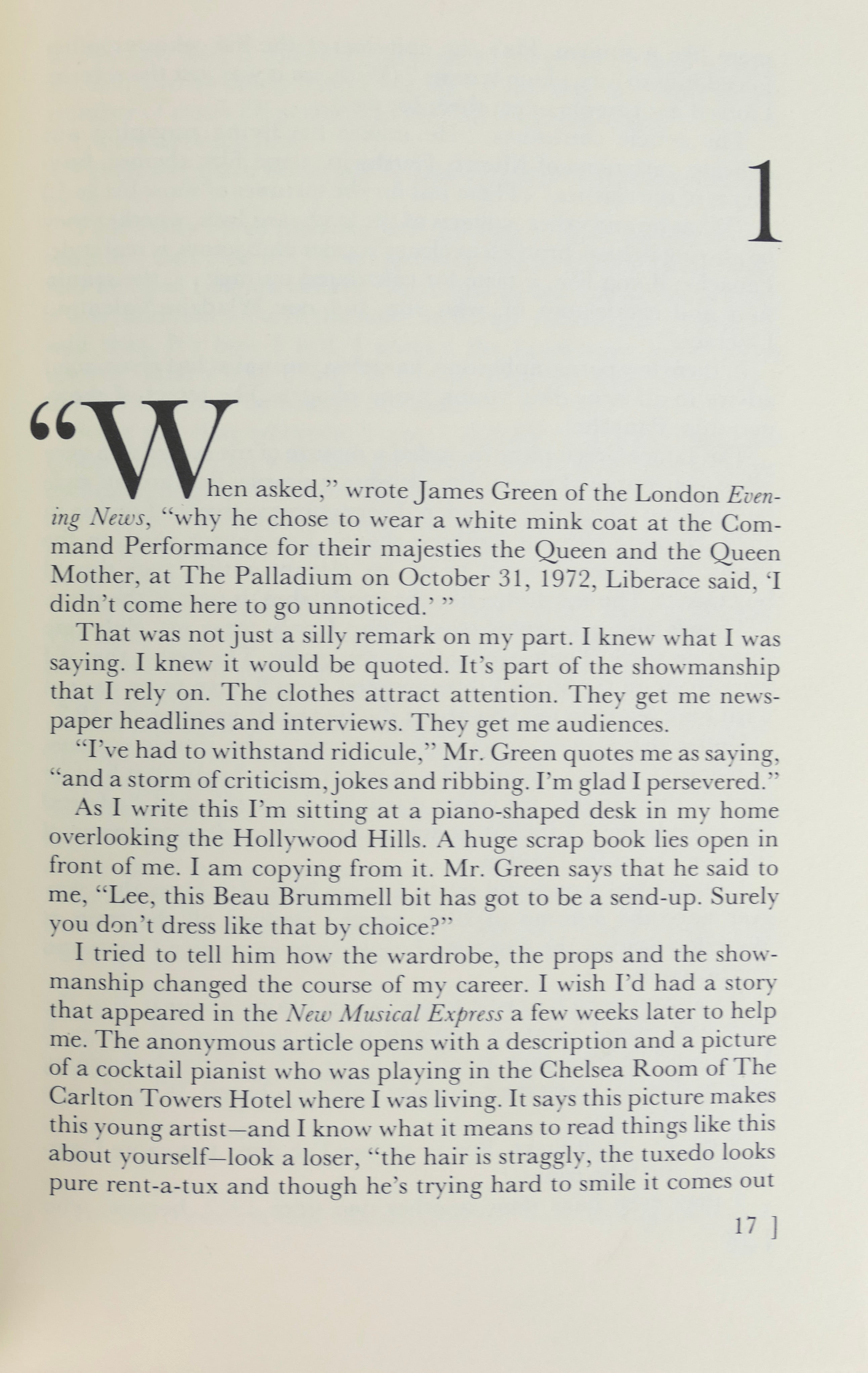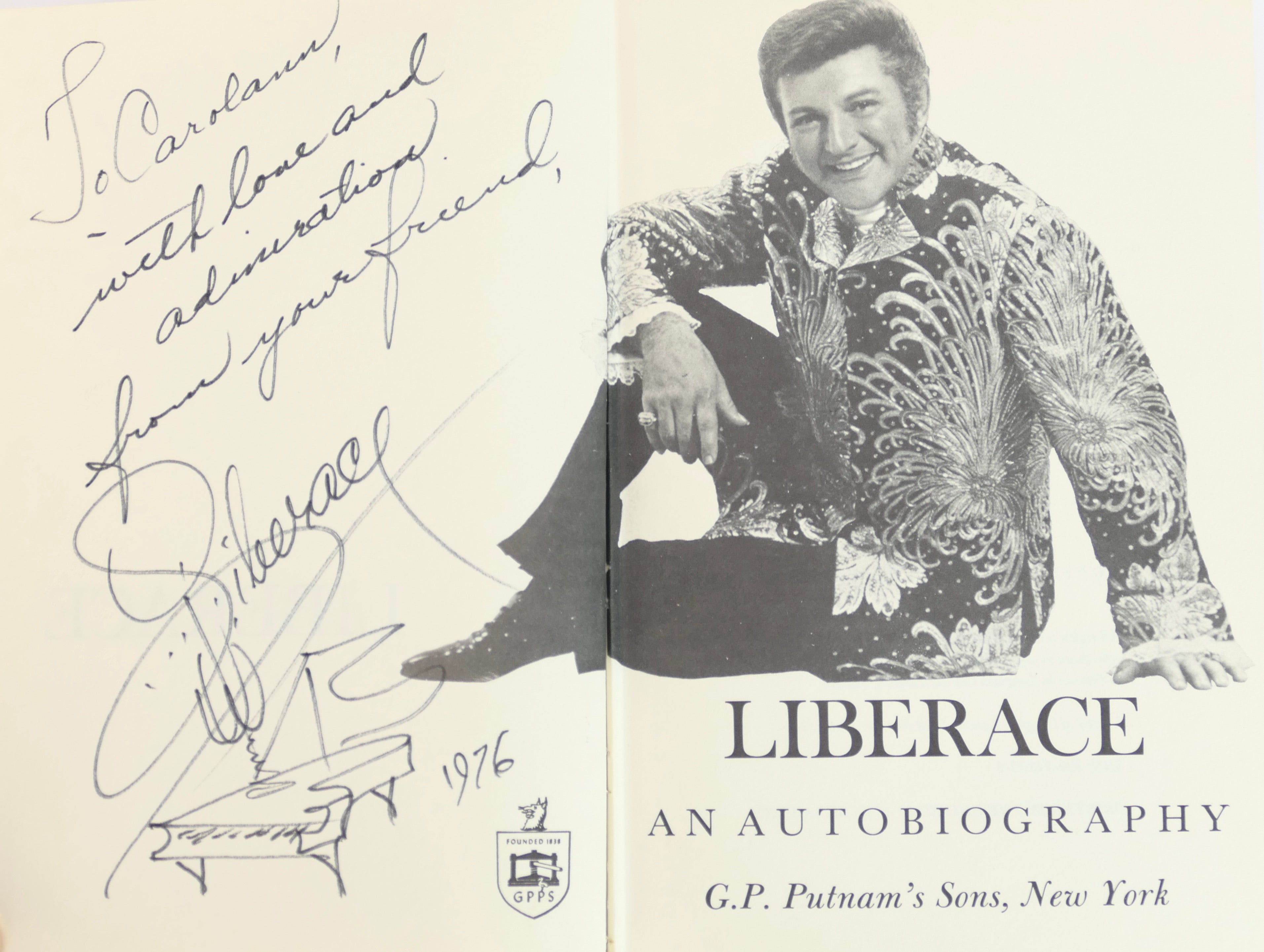 Hardcover. 8vo. 316 pp. Signed and inscribed by the famous American pianist and vocalist on the title page, "To Carolann, / with love and / admiration / from your friend / Liberace" in black ink. Beneath his signature, Liberace has added an original drawing of his trademark candelabra atop a grand piano. 14 pages of black and white illustrations. With original dust jacket, not price clipped, but rather scratched and worn. Interior pages clean and bright, in beautifully evocative gold boards. Very good overall.