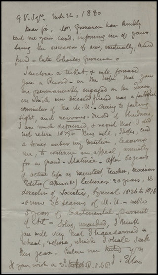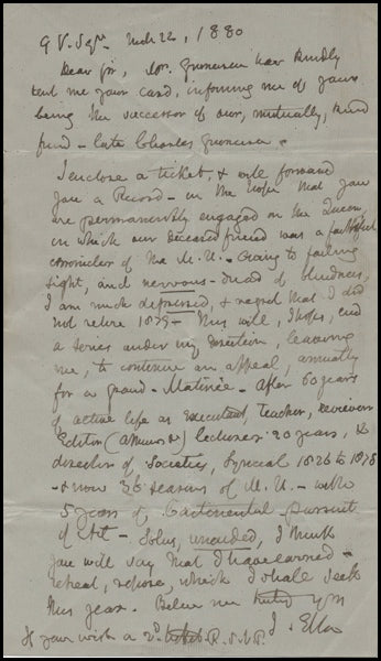 A rare and important 1-page letter written by the eminent British violinist, ciritic and concert manager. Announcing his retirement "owing to a failing sight and a nervous dread of blindness, I am depressed and regret that I did not retire...after 60 years of active life as executant (performer), teacher, editor, director..." Dated 1880, in very fine condition.