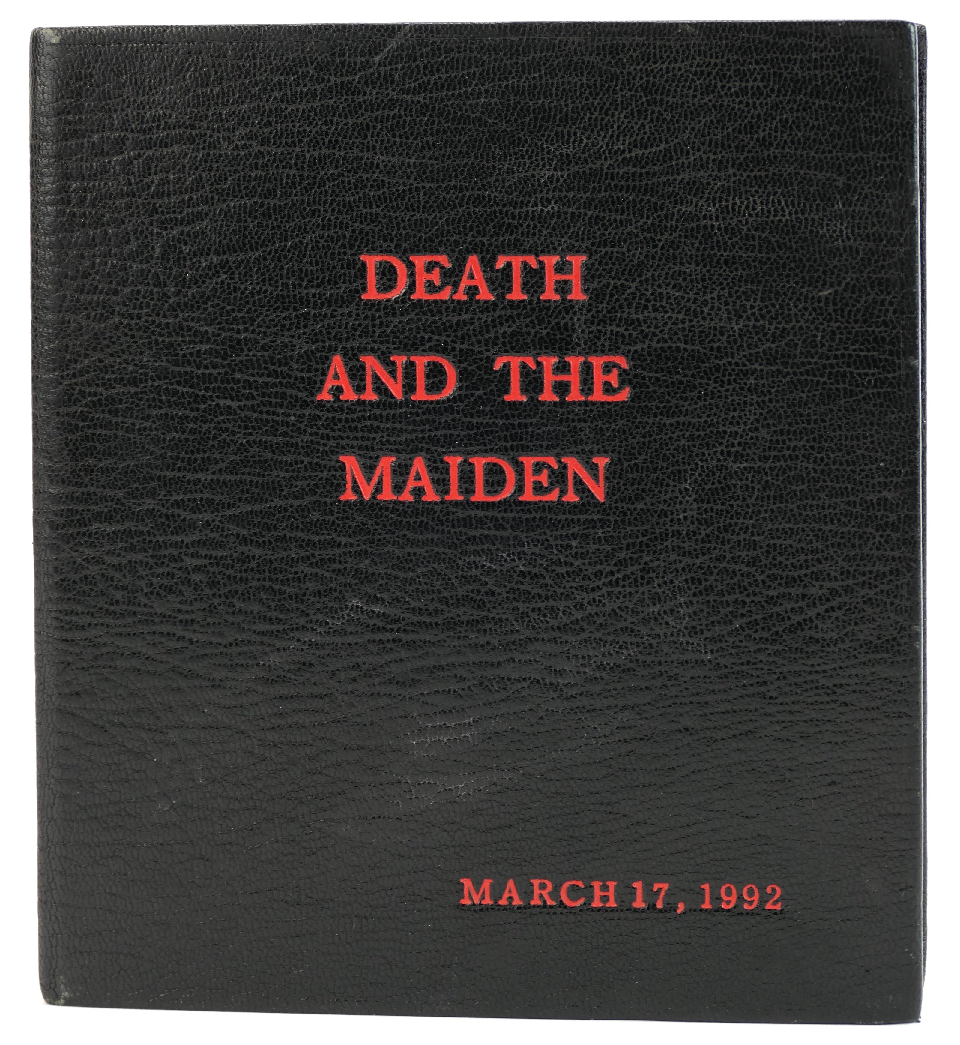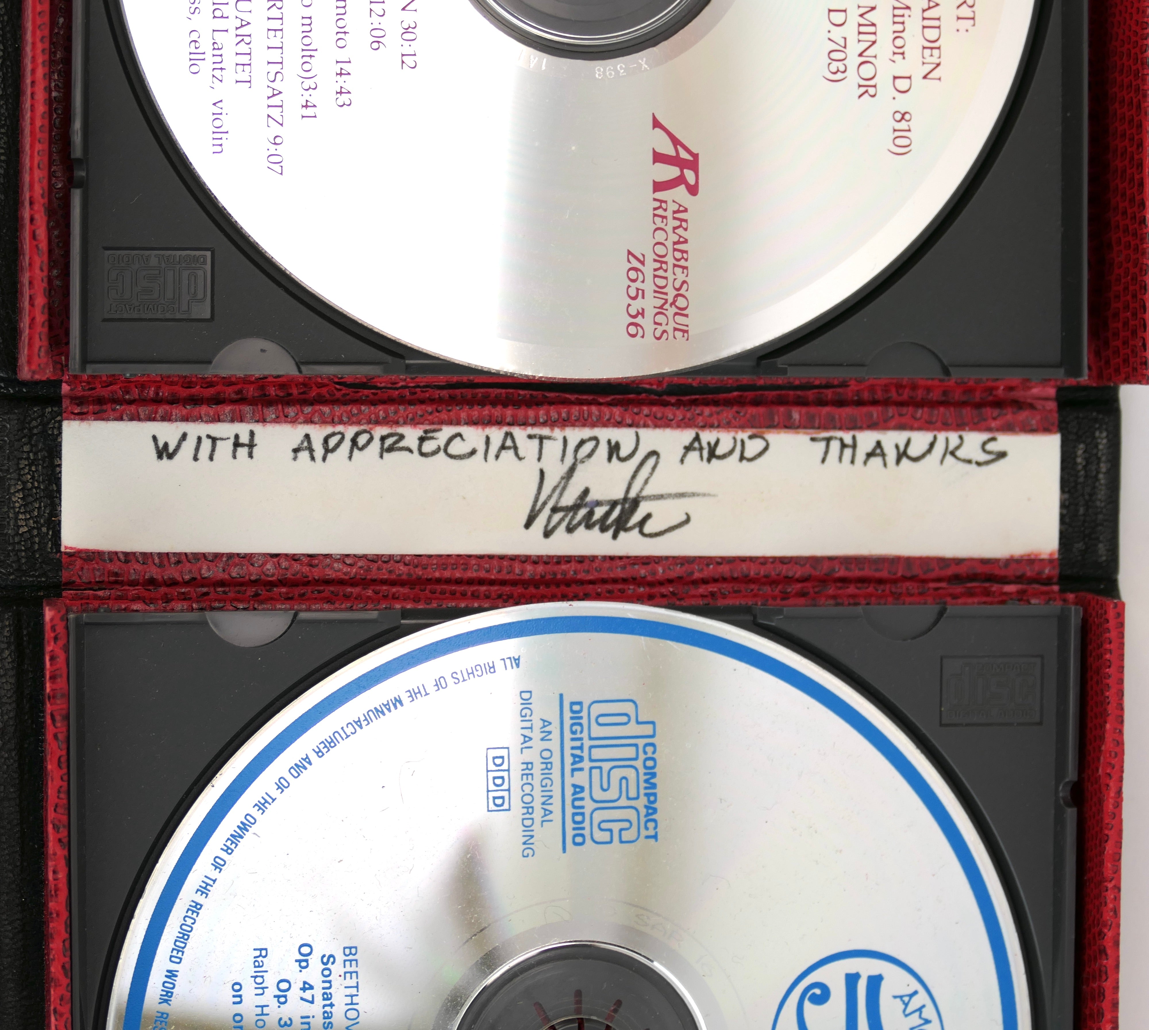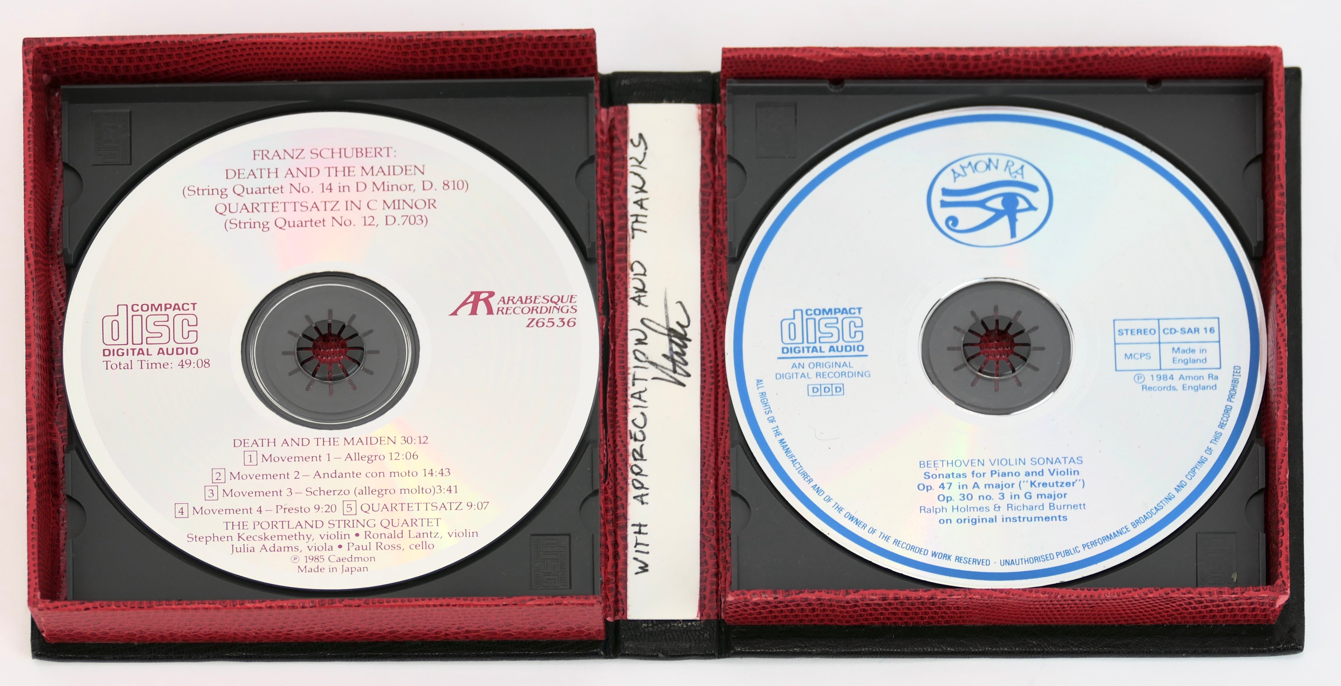 Lavish custom fine leather cd case binding, black calf and red snake patterned, commissioned by director Mike Leigh from the Vogel Bindery, NY as an opening night gift to the cast and crew. This example retained by the creators and inscribed to Paul Vogel by Leigh on an interior pastedown 'With appreciation and thanks / Mike." Two cds are enclosed: Portland String Quartet playing Schubert Death and the Maiden and Quartettsatz (Arabesque Z6536) and Ralph Holms and Richard Burnett performing Beethoven Violin Sonatas (Amon Ra, 1984). Light wear to binding, cds untested but apparently fine.