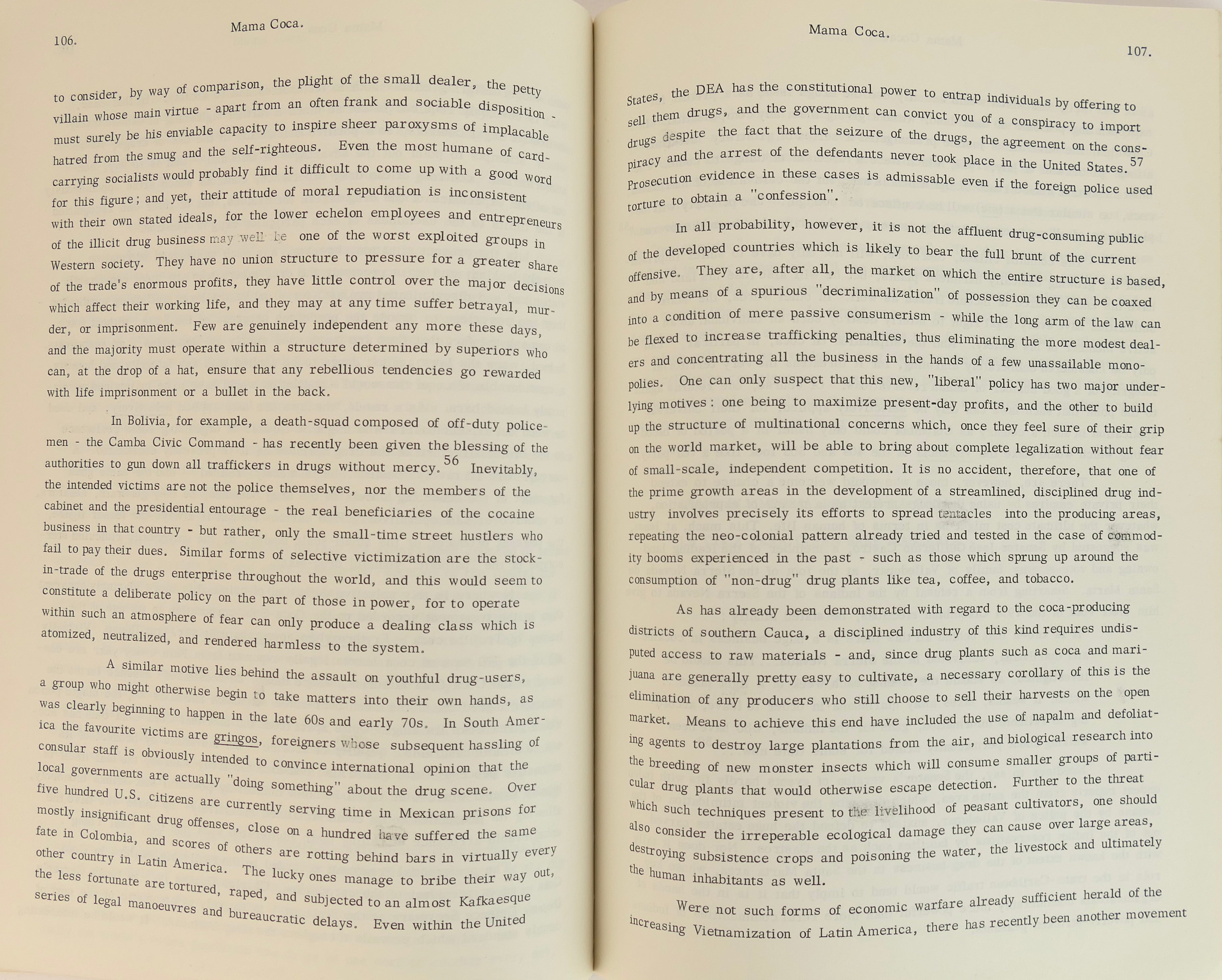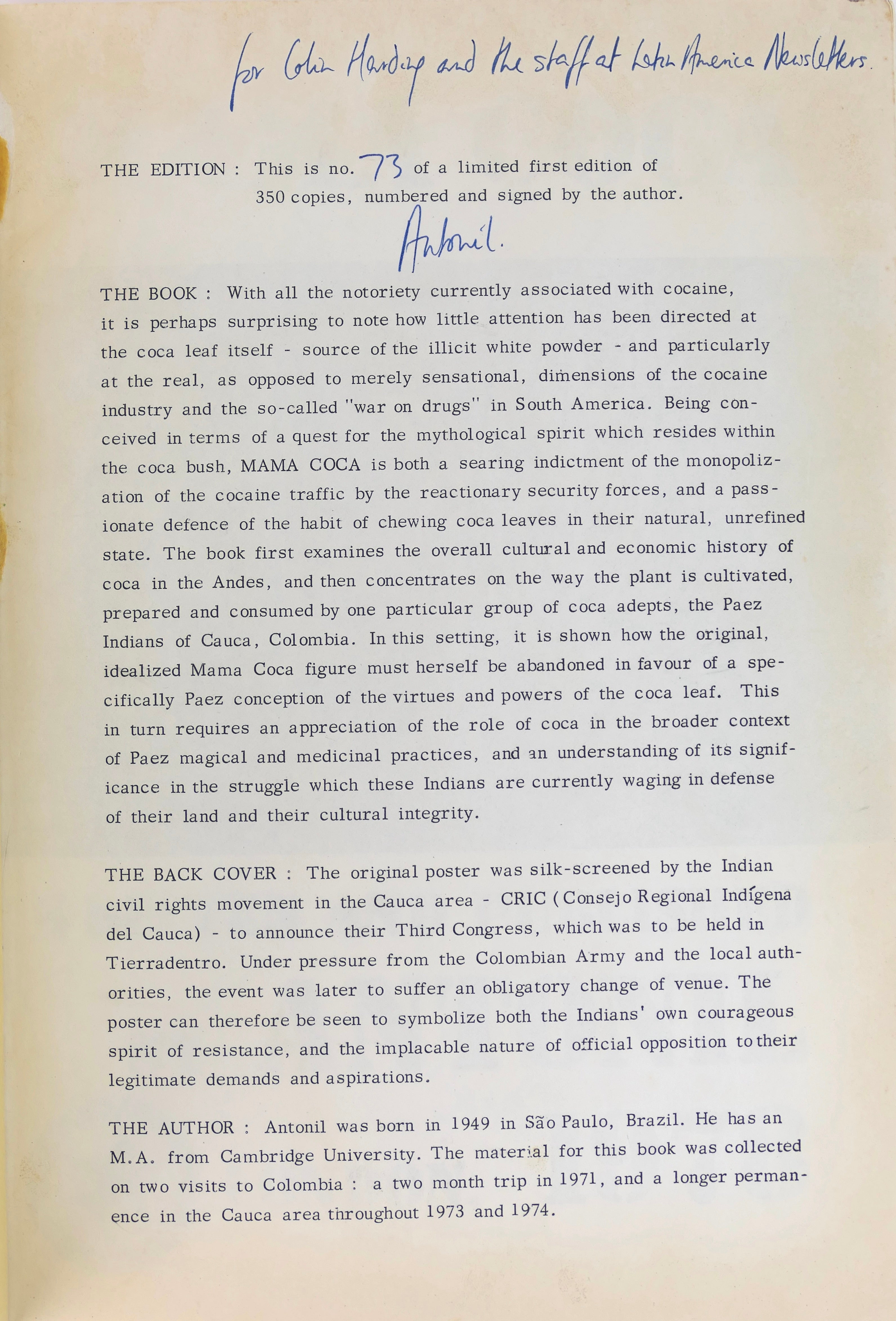 The author, born in 1949 in Sao Paulo, Brazil, collected material for this book on two visits to Columbia in 1971 and 1973/74. "Mama Coca is both a searing indictment of the monopolization of the cocaine traffic by the reactionary security forces, and a passionate defence of the habit of chewing coca leaves in their natural, unrefined state. The book first examines the overall cultural and economic history of coca in the Andes, and then concentrates on the way the plant is cultivated, prepared and consumed by one particular group of coca adepts, the Paez Indians of Cauca, Columbia."