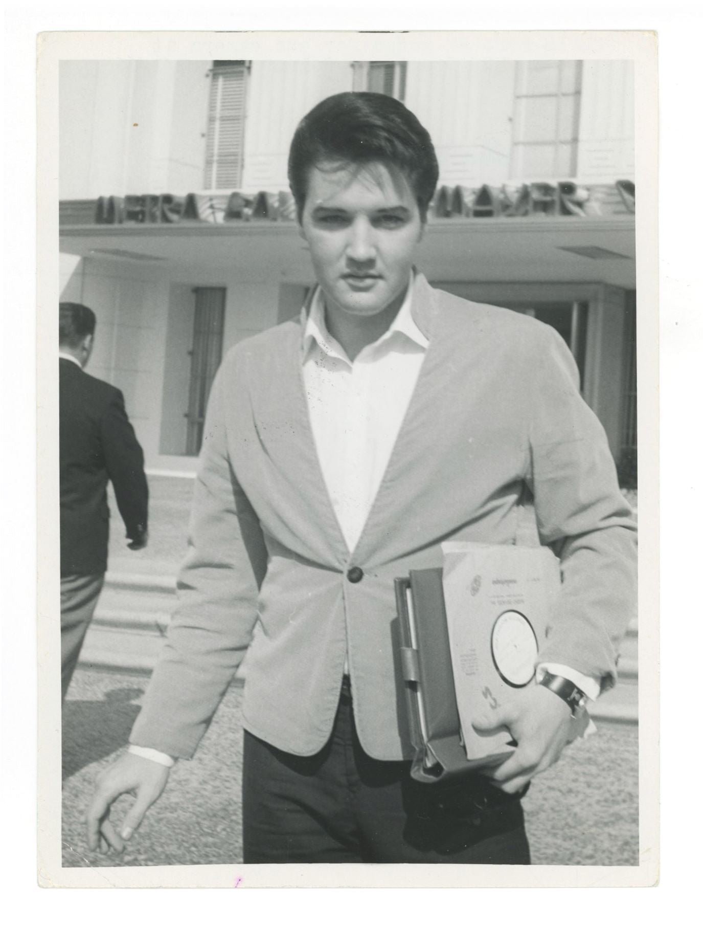 Fantastic original black and white candid photograph of a Young Elvis taken outside MGM Studios in Culver City on July 1, 1966. Presley is seen casually dressed, holding a record and paperwork. The reverse bears the original stamp from Toller’s, Sioux City, IA, dated July 18, 1966, along with the typed caption: “Elvis Presley poses for our camera at MGM Studios – Culver City 7/1/66.” 5 x 7 inches. Fine.