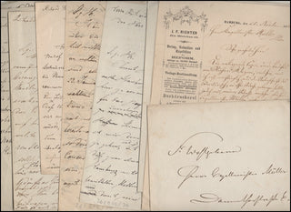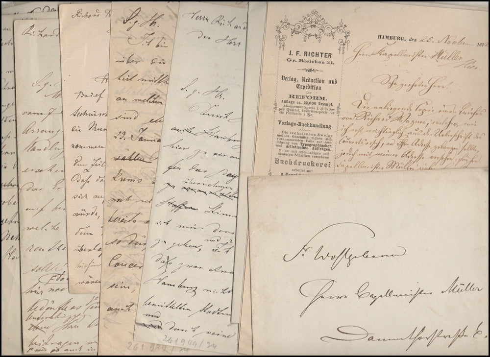 Wagner, Richard. (1813–1883) & Müller, Adolf. (1839–1901). Important Correspondence regarding Hamburg performances of 1873. An important series of letters concerning Richard Wagner's Hamburg concerts of January 21 and 23, 1873, primarily from Adolf Müller, but also including letters from Eugen Richter, Fritz Schubert, Zacharias, as well an autograph envelope in the hand of Wagner, and a series of original telegrams from Wagner. The Austrian composer and conductor, Adolf Müller was conductor in Hamburg before returning to Vienna to fill his famous father's positions as Kapellmeister and Hauskomponist at the Theater an der Wien. He is now mostly remembered for his operetta “Wiener Blut,” based on his arrangements of dances by Johann Strauss. Letters in various sizes, formats, all in very good condition with usual folds etc. All letters in German, translated in full as follows: