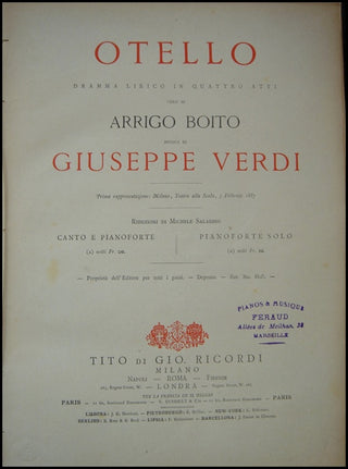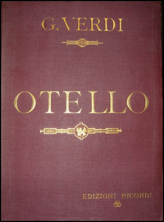 Verdi, Giuseppe. (1813-1901). Otello. Dramma Lirico in Quattro Atti. . Milan: Ricordi. [1887]. First edition. Versi di Arrigo Boito. Riduzioni di Michele Saladino. Pianoforte Solo. 27,7x19,5 cm; (8), 214 pp. [PN] 51107. Ricordi blindstamp of 1887. Original gilt-stamped crimson boards. Spine chipped at extremities, boards worn, 1887 ownership inscription on half-title. Internally in very fine condition. Rare first edition of the version for pianoforte solo, parallel to Hopkinson 63A.
