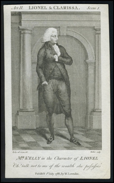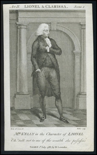 The engraving, 9 X 16 cm, was published in 1788 by W. Lowndes and shows Kelly in costume as Lionel in Dibdin's "Lionel & Clarissa." It was in this role that he made his Drury Lane debut in 1787, introducing an original duet which Nancy Storace had orchestrated after the two great singers had only recently returned from Vienna. In excellent condition.
