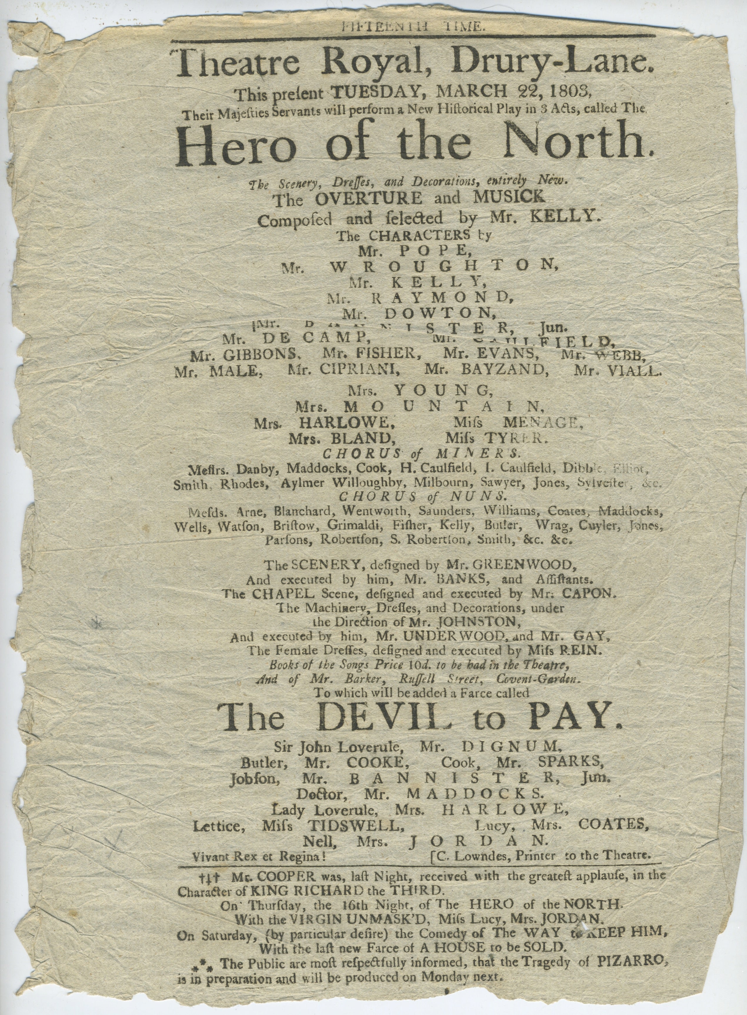 Kelly, Michael. (1762-1826). Rare Original Drury Lane Broadside. Original broadside advertising the historical musical drama "Hero of the North," for which Kelly had composed the music and in which he also performed. According to his memoirs, "it was received with distinguished applause." (Reminiscences of Michael Kelly, p. 183)