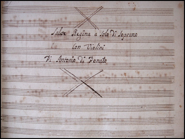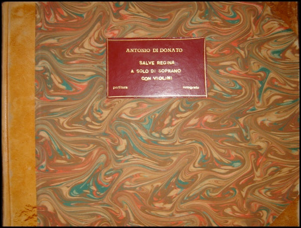 Comprising four movements (the arias "Salve Regina", "Ad te clamamus", "Eja ergo advocata nostra" and the recitative and aria "Et Jesum benedictum fructum... O clemens o pia"), written apparently by the composer, the title-page inscribed "Salve Regina a solo di soprano con violini Di Antonio di Donato," notated in brown ink on two four-stave systems per page, with some erasures and corrections.