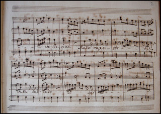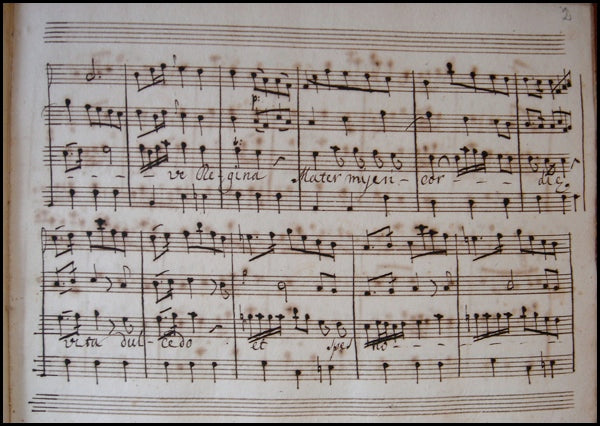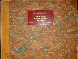 Donato, Antonio di. (ca. 1750). Eighteenth-century manuscript: "Salve Regina" in B flat for Soprano and Strings. . 30 pages, plus blanks, oblong 4to (c.22.1 x 29cm), 10-stave paper, watermark of the letter "M" in a circle and the letters "PT", modern pencil pagination ('1'-'29') beginning on first page of music, modern half calf, no place or date [second half of the 18th century].