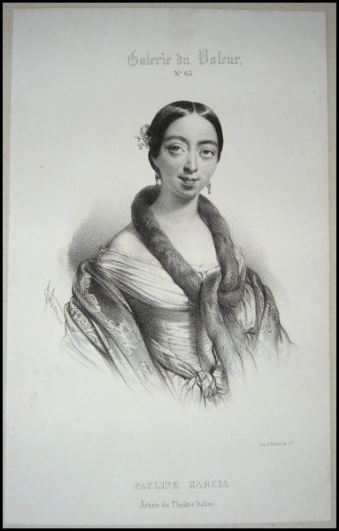 Viardot, Pauline. (1821-1910). Early Lithograph Portrait by Julien. A rare early portrait by Julien entitled "Pauline Garcia / Artise du Théatre Italien," ca. 1839. No. 63 from the series "Galerie du Voleur, " printed by d'Aubert & Co.. Viardot is shown in half-length looking directly out from the image. 14.5 X 23 cm. In very good condition.