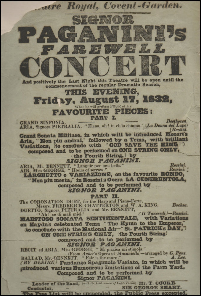 Paganini, Nicolò. (1782–1840). Broadside: Signor Paganini's Farewell Concert (1832). 1832. Broadside, tipped on to card. Loss at upper left corner, affecting one word (Theatre), some chipping and creasing at edges.