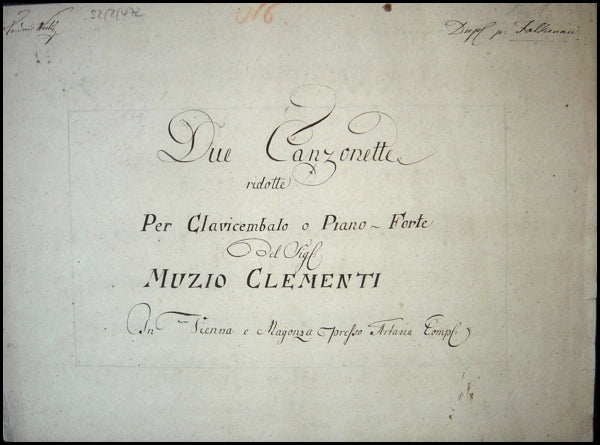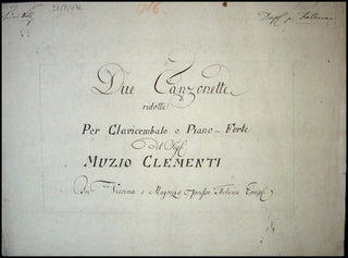 Clementi, Muzio. (1752–1832). Due Canzonette, 18th C. Copyist Manuscript. Due Canzonette ridotte Per Clavicembalo o Piano-Forte del Sig. Muzio Clementi. In Vienna e Magonza presso Artaria Comp. Oblong folio. Title, 6pp. Laid paper with partial man-in-the-moon watermark visible on one leaf.