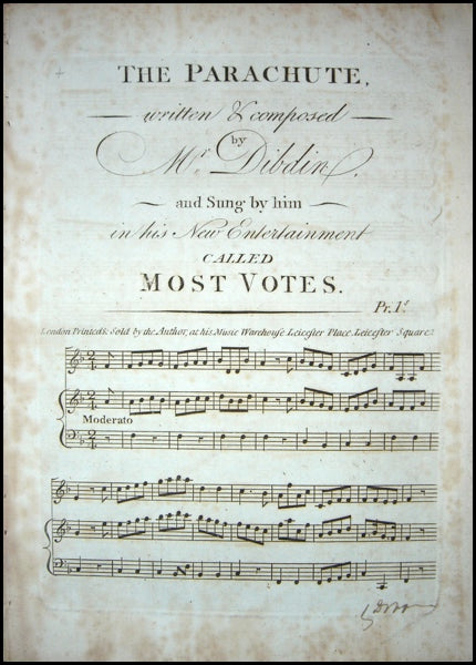 [Most Votes] Dibdin, Charles. (1745-1814). The Parachute, SIGNED. . London: Printed and Sold by the Author. [1802]. First edition. Unbound folio. 3 pp. For voice and piano, with an additional arrangement for two flutes. Engraved throughout. Signed at the foot of the first page by the prominent English composer, dramatist, impresario and singer.