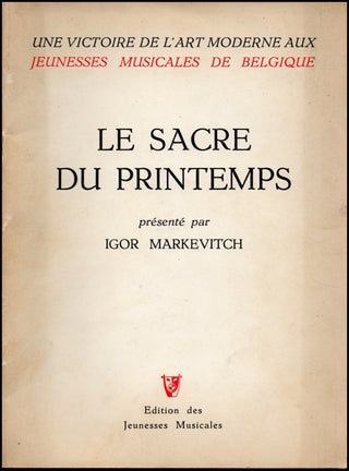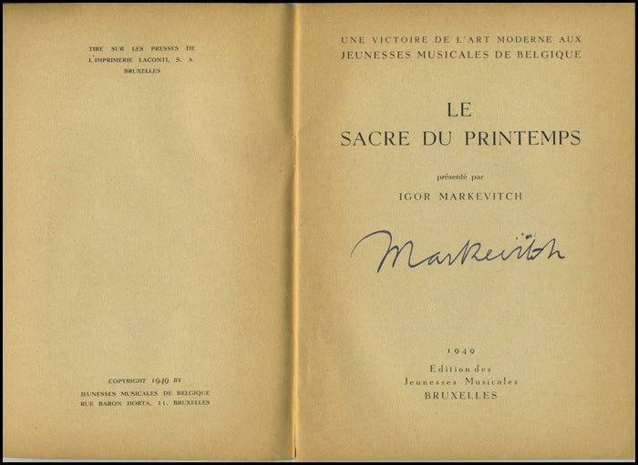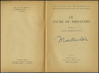 "Une victoire de l'art moderne aux Jeunesses Musicales de Belgique." Small 8vo. 47 pp. Boldly signed by Markevitch on the title page. Covers lighly toned, else fine. An in-depth essay on Stravinsk's "Rite" by Markevitch, including photographs and numerous musical examples, signed by the Ukrainian-born conductor whose early connections with Diaghelev led to to his famous work in 1930s Paris as conductor & composer and who was particularly known for his performance of Russian twentieth century repertory.