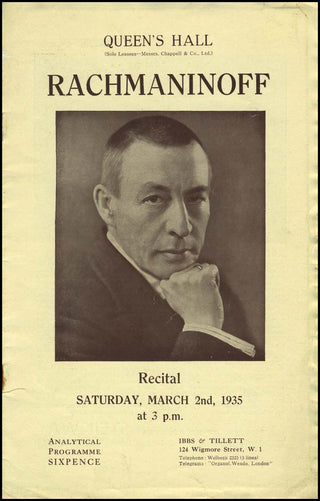 An original 1935 Queen's Hall recital program from the great pianist and composer. A typically ambitious program, he played works by Beethoven, Chopin, Borodin, Dohnanyi, Rubinstein, Scriabin, Medtner, Balakireff, as well as several of his own compositions. Features a striking photograph on the cover and the inside portion is printed on fine heavy paper.