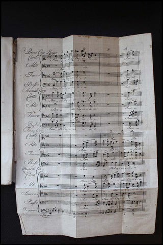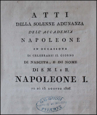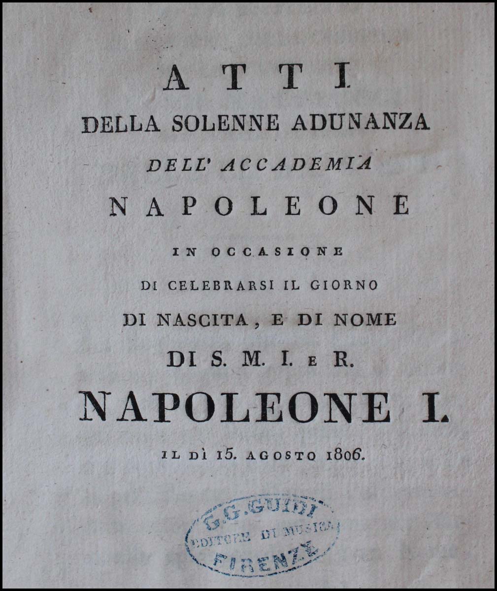 [Napoleon Bonaparte (1769-1821)] (Santucci, Marco). Atti della solenne adunanza dell' Accademia Napoleone in occasione de celebrarse il Giorno di nascita, e di Nome DI S. M. I. e R. Napoleone I. Il di 15. Agosto.. Lucca: Accademia lucchese di scienze, lettere ed arti. [Francesco Bertini]. 1806. First edition. Original wrappers. 11 leaves of engraved music. Wrappers heavily torn, some leaves shaken or partly detached, a few minor stains, but an otherwise good copy of a rare and fragile item of considerable interest.
