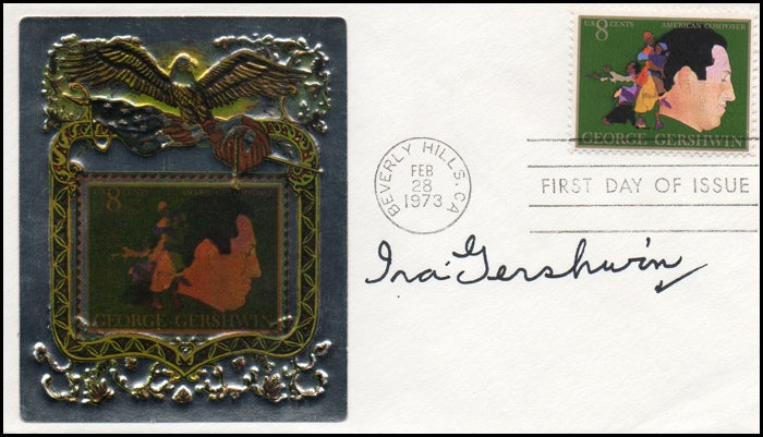 American librettist and lyricist, brother of composer George Gershwin and writer of the lyrics for dozens of songs, most notably in "Porgy and Bess." Bold signature on a first day commemorative postal cover honoring his brother, George Gershwin, 1973. Fine.