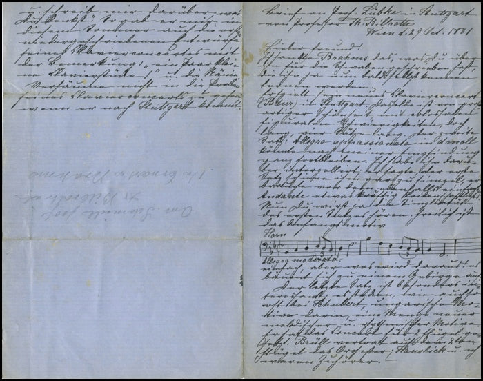 A handwritten copy of an 10/29/1881 letter from the Prussian surgeon and amateur musician, famous as a close friend of Brahms in Vienna from 1867. The letter deals extensively with a recent Brahms performance and includes musical notation. The present copy of the letter, addressed to Prof. Lubke in Stuttgart, is apparently in the hand of Friederike Sauermann, a singer in the Hamburger Frauenchores, a member herself of the Brahms/Schumann circle, and an intimate of Eugenie Schumann, daughter of Clara Wiek and Robert Schumann. While the present letter is to our knowledge unpublished, it may have been copied by Sauermann in the context of her correspondence with Eugenie Schumann in the preparation of her published memoirs.