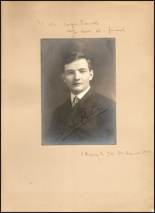 Kolar, Victor. (1888 - 1957). Signed Photograph. Early photograph of the Hungarian-born American composer and conductor, signed and inscribed to Josef Franzl, horn player of the first New York Chamber Music Society. Signature on a photograph of 4 x 5.5 inches, mounted to a larger page with inscription and date. Light silvering to photograph, overall very good.