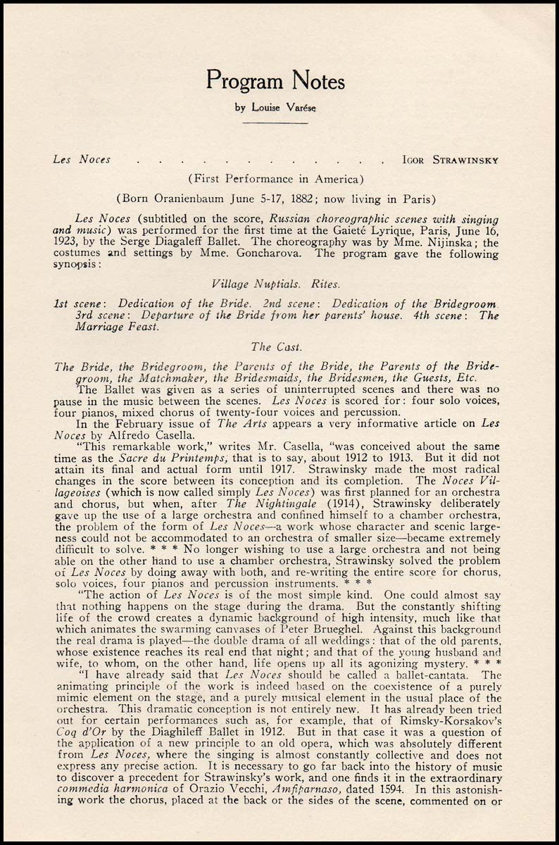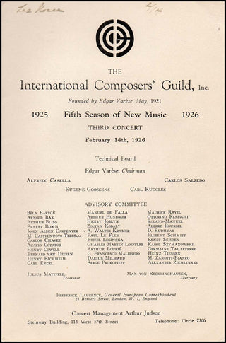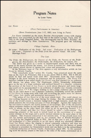 Original 1926 program from the International Composer's Guild, founded by Edgar Varese and Carlose Salzedo five years earlier. The program features the first US performance of Stravinsky's "Les Noces," and includes the full original synopsis and texts. The concert also featured the first New York performance of Alfredo Casella's "Concerto for String Quartet." The advistory committe from the Guild, listed on the cover, includes an astonishing collection of many of the leading composers and performers of the period. Some splitting at spine, "Les Noces 2/14" written in faded ink at head of cover, otherwise fine. 8 pp.