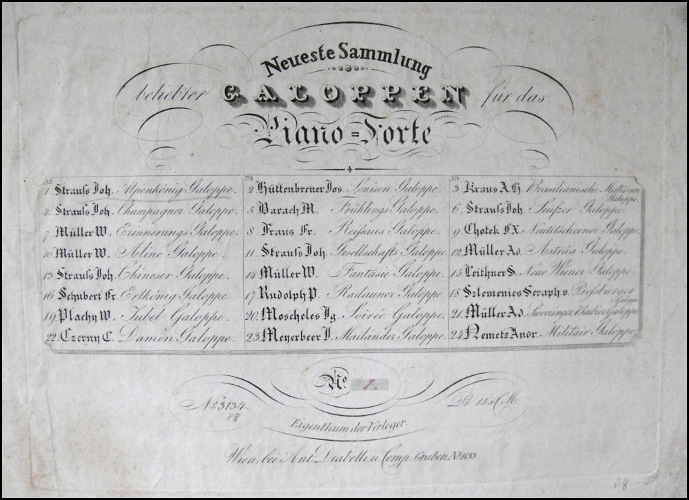 "On 22nd September 1828 Johann Strauss wrote quite awkwardly to his publisher Anton Diabelli: 'Since from now on I am tied by a contract with Herr Haslinger in so far as to hand over to him each of my compositions, I cannot in the future be at your service, as I hereby notify you.' One can imagine how annoyed the ambitious Salzburg-born publisher Diabelli was, when he received this letter and Johann Strauss sent him back fourteen gulden that he had paid him for the next piece. The business with the dance melodies of Joseph Lanner and Johann Strauss was already profitable and he had been glad to have it for his publishing house. Diabelli reacted by publishing all the galops that Strauss had given him in an edition with the title Neueste Sammlung beliebter Galoppen für das Pianoforte (Newest Collection of Favourite Galops for the Pianoforte). This collection was advertised in the Wiener Zeitung on 15th December 1828." (Keith Anderson, "Johann Strauss I Complete Edition," Vol. 1)