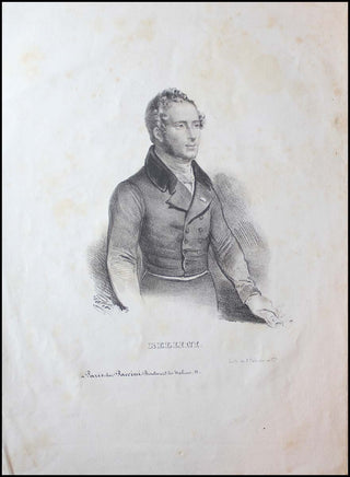 A fine original lithograph portrait by J. Caboche after the original by Victor. Issued in Paris by the publisher Paccini c. 1840 as the frontispiece to their issue of "I Puritani." Scattered light foxing, overall very good. 23.5 x 32 cm. Not in the Harvard Theatre Collection of Engraved Portraits.